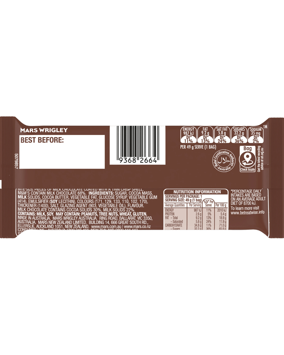 Call off the search! Because those deliciously fun chocolate snacks you've been looking for are right here in this pack of M&M's Milk Chocolate legends! Since 1941, these colourful pieces of creamy milk chocolate coated with a thin crisp shell have delighted chocolate lovers across the globe. M&M's bite-size chocolates are ideal as an on-the-go treat, in the workplace or as a chocolate snack for movie nights. M&M's make boring meetings go faster, too! They will rocket You into fave person territory when you share them as chocolate treats and sprinkle their happy M&M's chocolate colours into baking recipes, popcorn TV snacks and over ice cream. Movies at your place? It starts with M&M's chocolates!