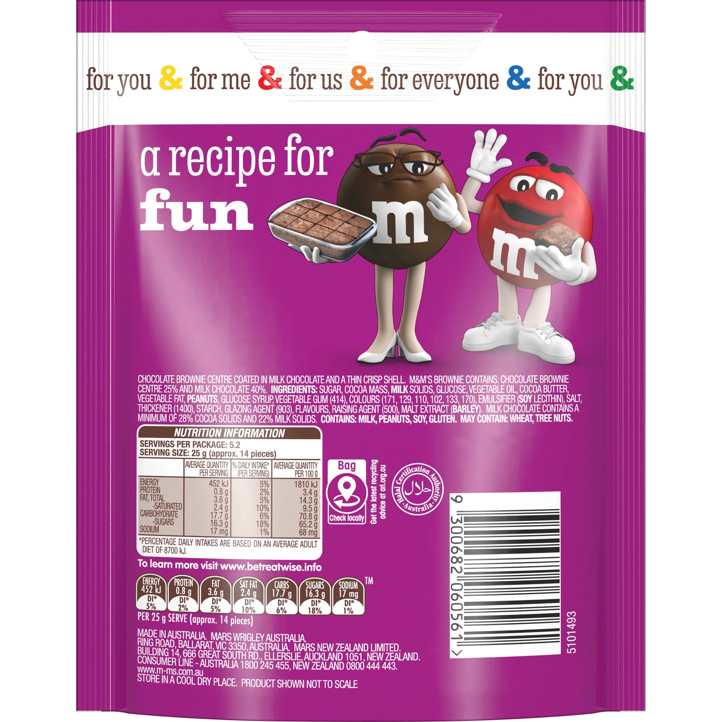 Call off the search! Because those deliciously fun chocolate snacks you’ve been looking for are right here in this pack of M&M’S Brownie! M&M’S Bite Size Chocolates are ideal as an on-the-go treat, in the workplace or as a chocolate snack for movie nights. M&M'S make boring meetings go faster, too! They will rocket YOU into fave person territory when you share them as chocolate treats and sprinkle their happy M&M'S Chocolate colours into baking recipes, popcorn TV snacks and over ice cream. Movies at your place? It starts with M&M’S Chocolates!
