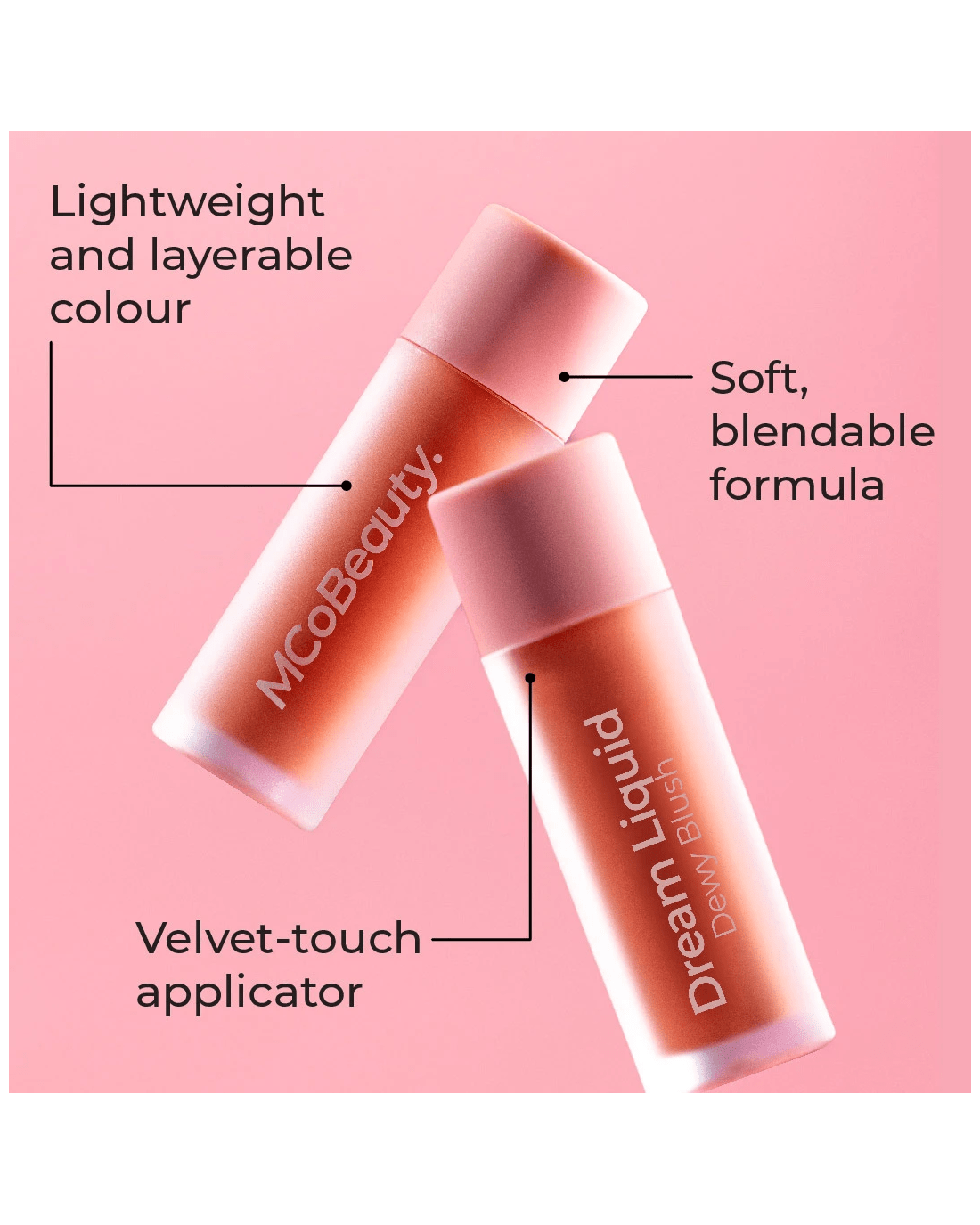 MCoBeauty Dream Liquid Dewy Blush is your one-and-done way to add a silky flush of colour to your cheeks. Wear it with or without makeup, layering intensity from a soft dewy flush to bold colour. It adds colour to your cheeks effortlessly, using the ultra-soft in-built applicator to dab on just the right amount of product.