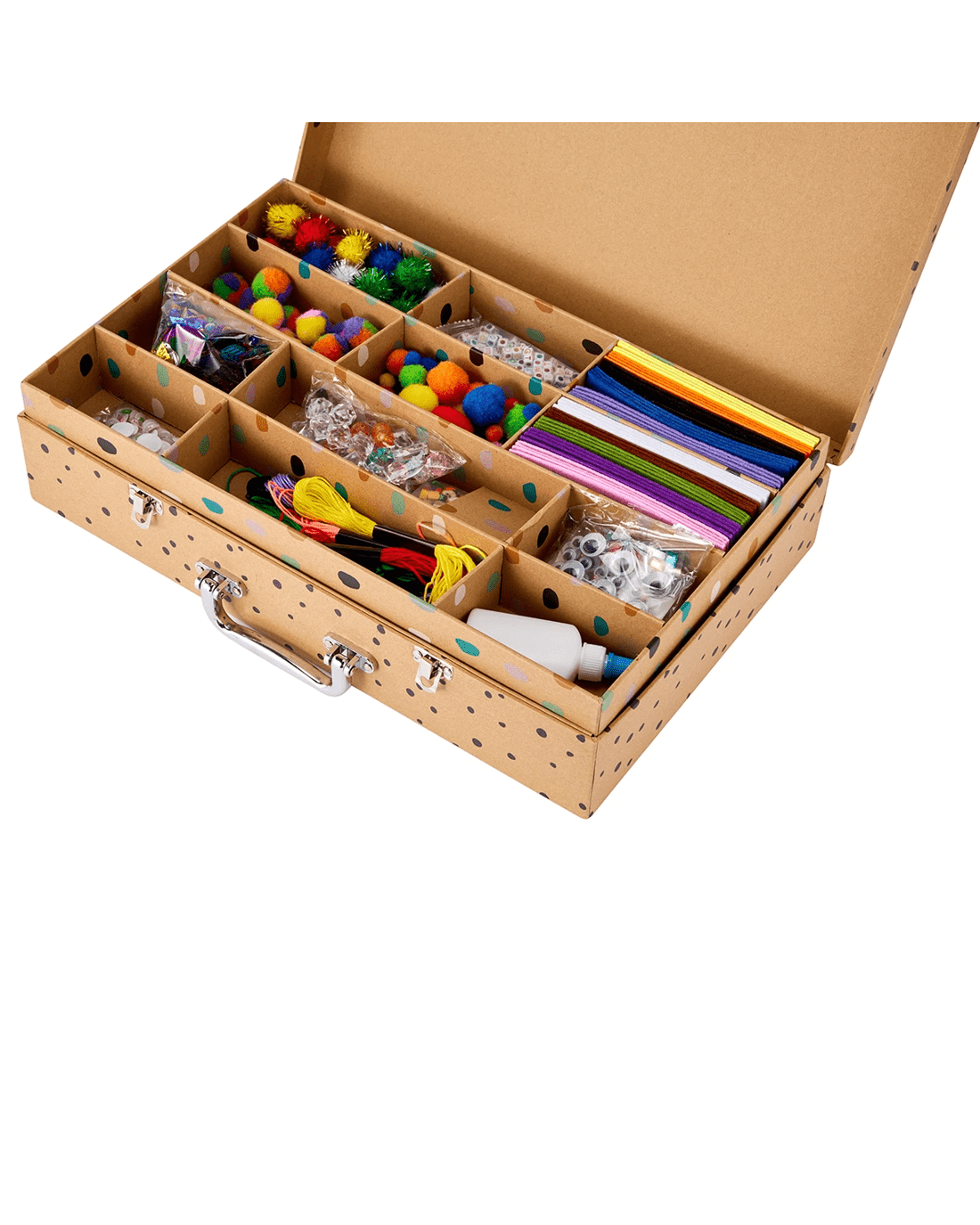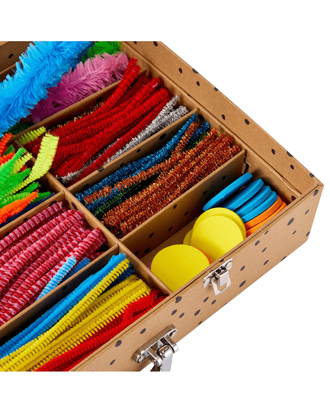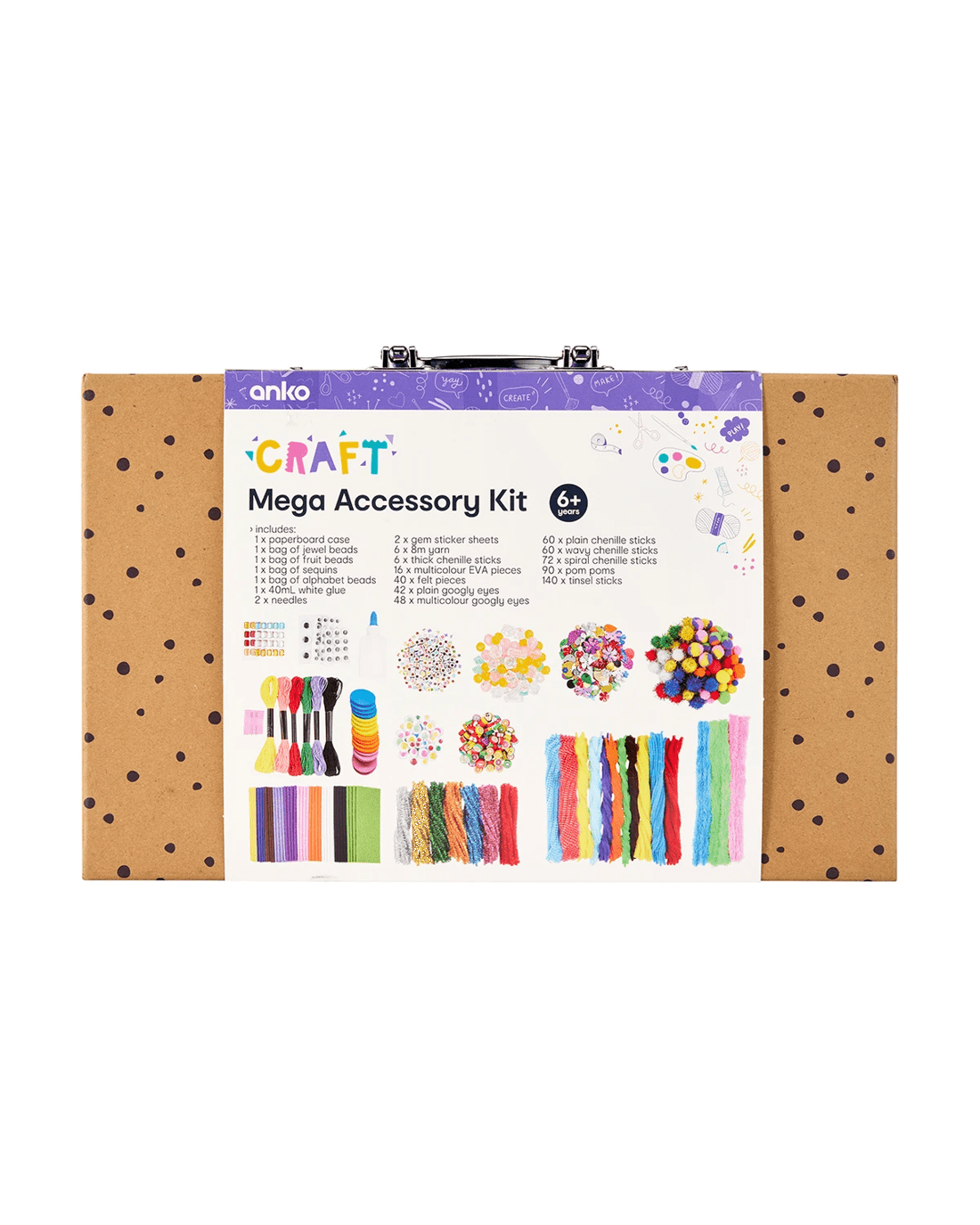 • Includes 1 x paperboard case, 1 x bag of jewel beads, 1 x bag of fruit beads, 1 x bag of sequins, 1 x bag of alphabet beads, 1 x 40ml white glue, 2 x needles, 2 x gem sticker sheets, 6 x 8m yarn, 6 x thick chenille sticks, 16 x multicolour EVA pieces, 40 x felt pieces, 42 x plain googly eyes, 48 x multicolour googly eyes, 60 x plain chenille sticks, 60 x wavy chenille sticks, 72 x spiral chenille sticks, 90 x pom poms and 140 x tinsel sticks