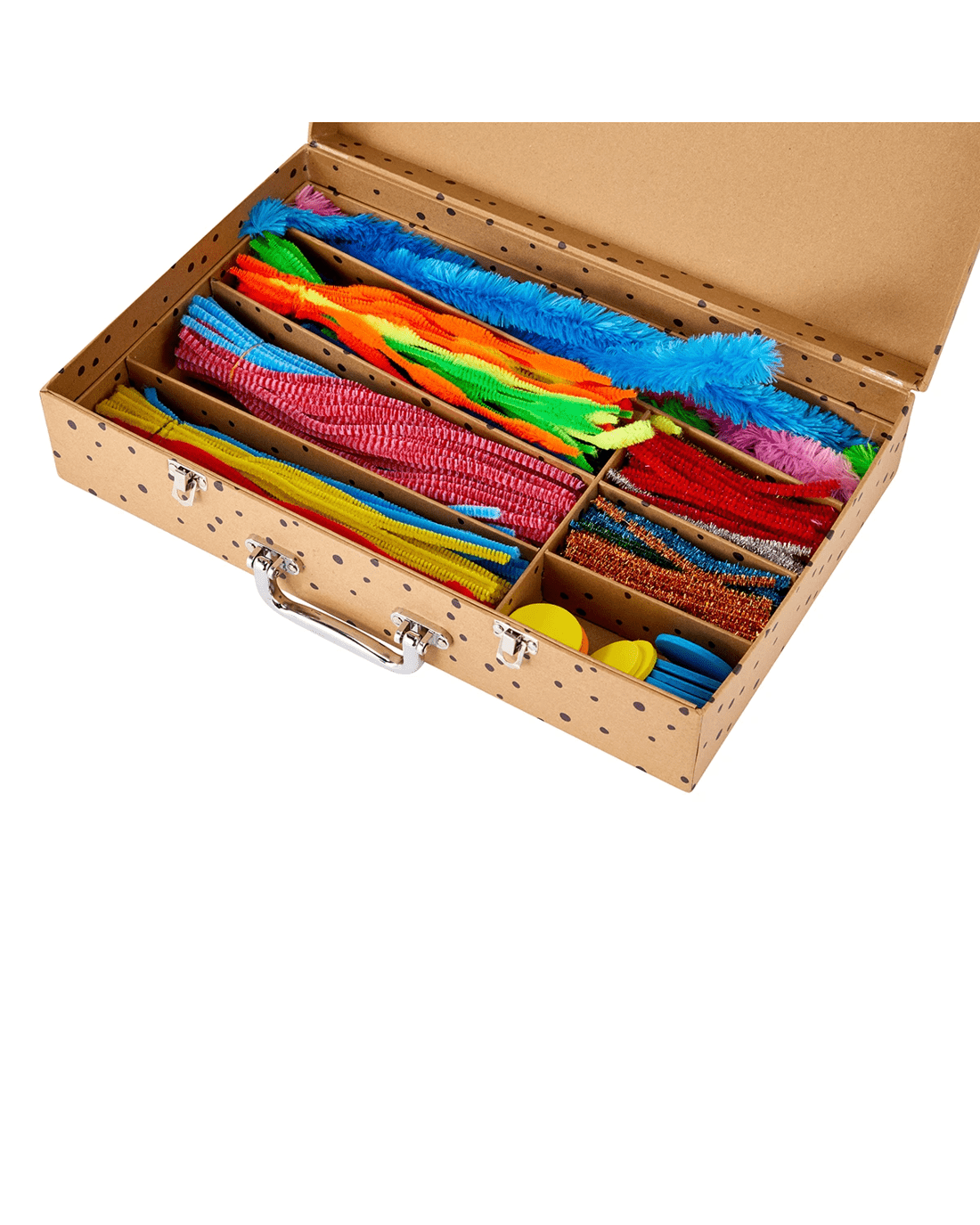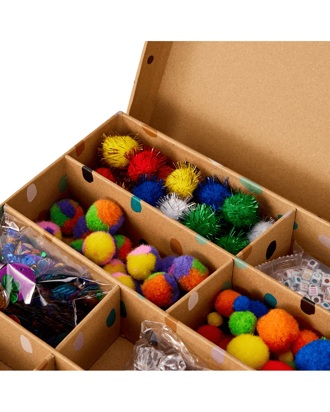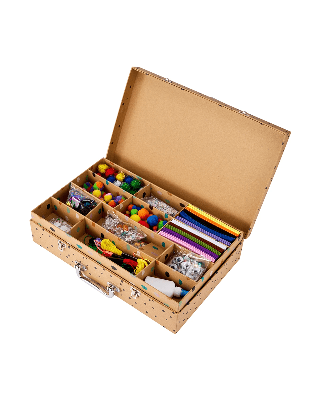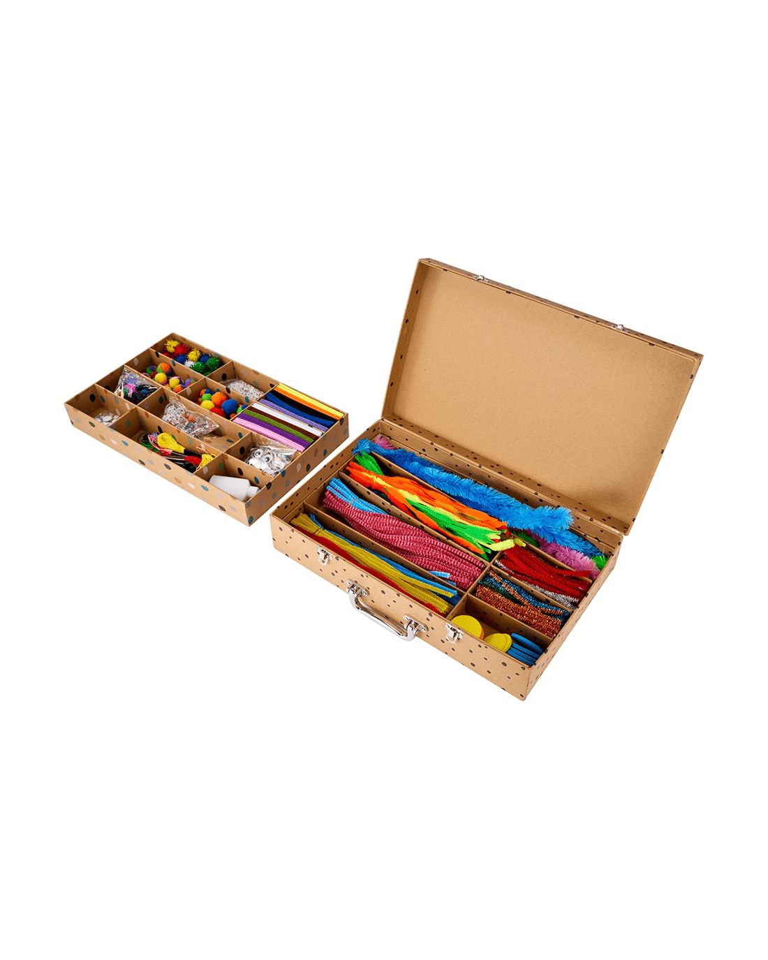 • Includes 1 x paperboard case, 1 x bag of jewel beads, 1 x bag of fruit beads, 1 x bag of sequins, 1 x bag of alphabet beads, 1 x 40ml white glue, 2 x needles, 2 x gem sticker sheets, 6 x 8m yarn, 6 x thick chenille sticks, 16 x multicolour EVA pieces, 40 x felt pieces, 42 x plain googly eyes, 48 x multicolour googly eyes, 60 x plain chenille sticks, 60 x wavy chenille sticks, 72 x spiral chenille sticks, 90 x pom poms and 140 x tinsel sticks