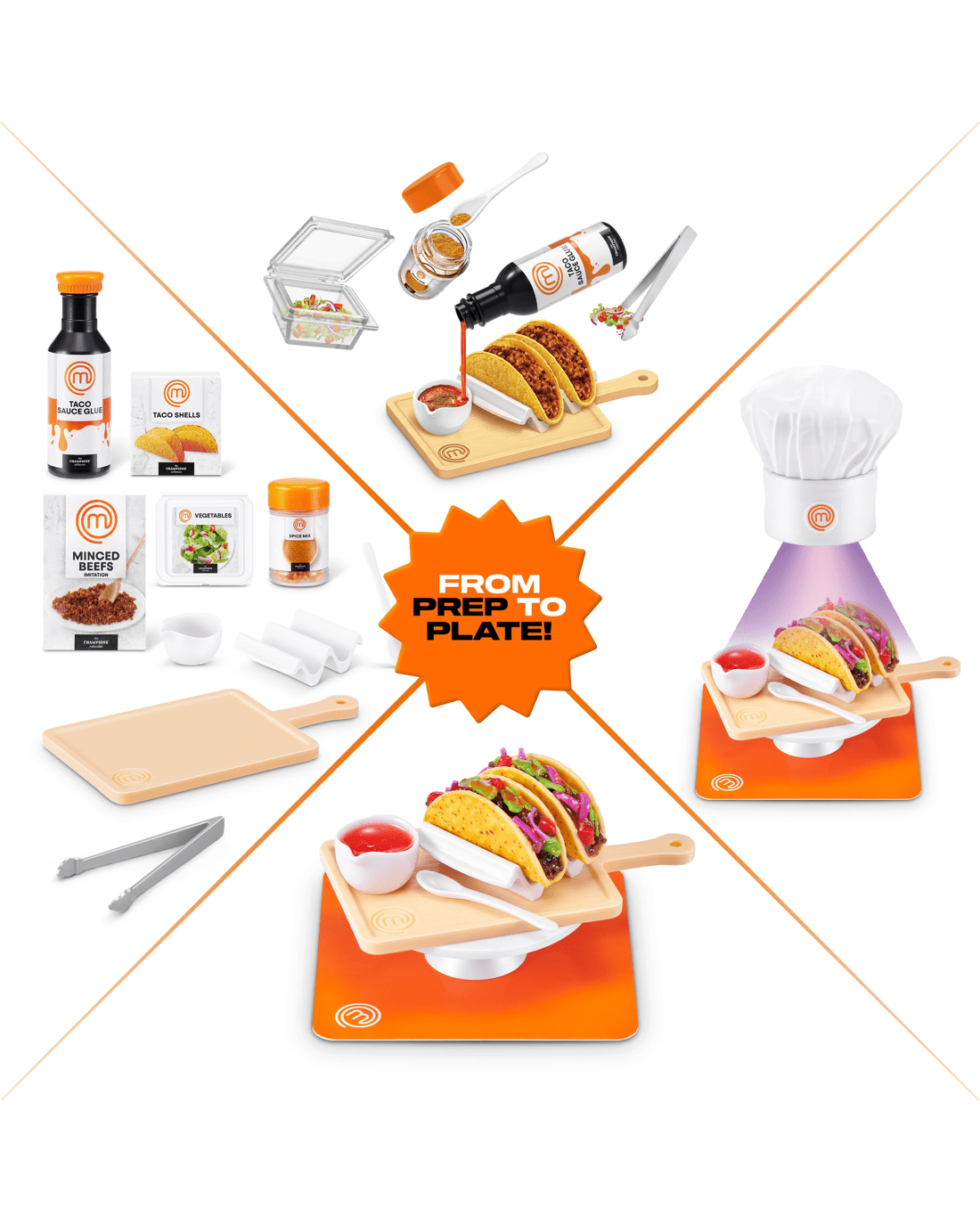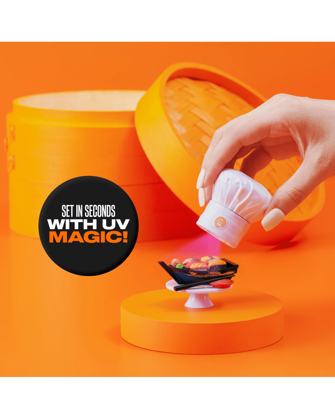 Mini Brands Create MasterChef Series 2 by ZURU is back, hotter, tastier and mini-er than ever! Inspired by real dishes from around the world, this capsule collection lets kids, teens and adults aged 6+ step into the spotlight as culinary creatives. Each capsule includes one mini MasterChef dish to build, ingredients and accessories, a real recipe card and a UV LED toque to cure resin and speed up the process. With 11 all-new dishes to create, from sushi to butter chicken, beef tacos to rare scented blueberry pancakes, every unboxing feels like stepping onto the MasterChef stage. The realism in each set is jaw-dropping, with sculpted textures and tiny toppings that look good enough to plate. Follow the real recipe to create the full-sized version at home or keep your dish as the ultimate collector’s piece. Powered by UV tech, designed for creativity and made with certified recycled plastic, this is not just a toy, it's a mini culinary experience. Create it. Collect it. Master it.