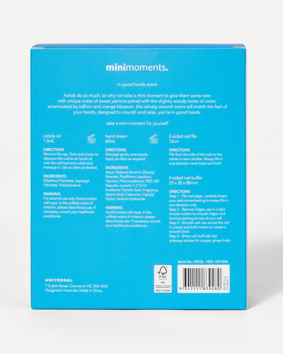 Product Details- Includes 1 x cuticle oil, 1 x hand cream, 1 x 4-sided nail buffer and 1 x 2-sided nail file