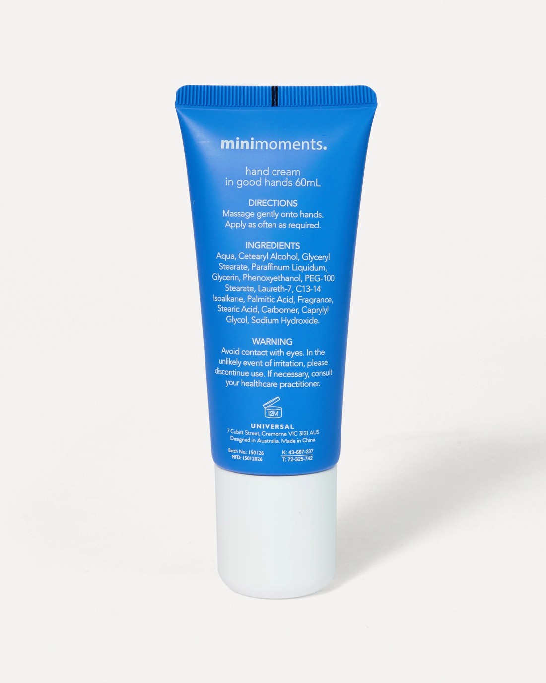 - Hand cream: Aqua, Cetearyl Alcohol, Glyceryl Stearate, Paraffinum Liquidum, Glycerin, Phenoxyethanol, PEG-100 Stearate, Laureth-7, C13-14 Isoalkane, Palmitic Acid, Fragrance, Stearic Acid, Carbomer, Caprylyl Glycol, Sodium Hydroxide