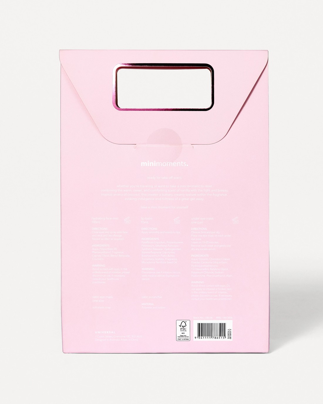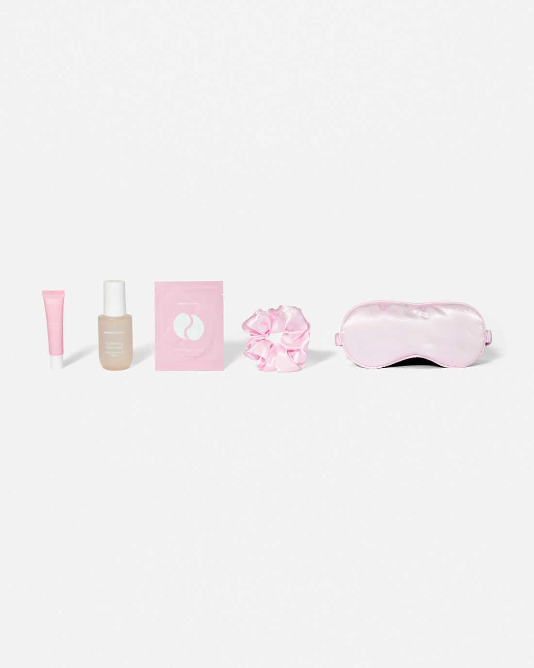 - Includes 1 x hydrating facial mist, 1 x lip balm, 1 x satin eye mask, 1 x pair of under eye masks and 1 x satin scrunchie