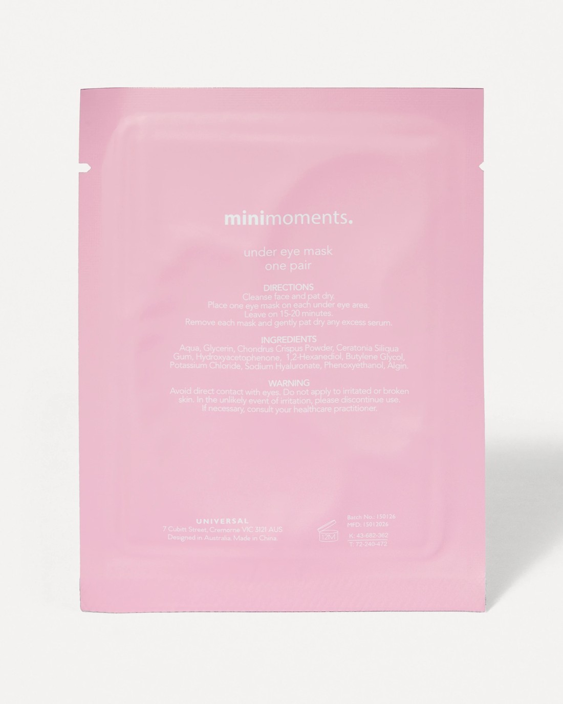 - Eye mask: Aqua, Glycerin Chondrus Crispus Powder, Ceratonia Siliqua Gum, Hydroxyacetophenone, 1-2 Hexanediol Butylene Glycol Potassium Chloride, Sodium Hyaluronate, Phenoxyethanol, Algin