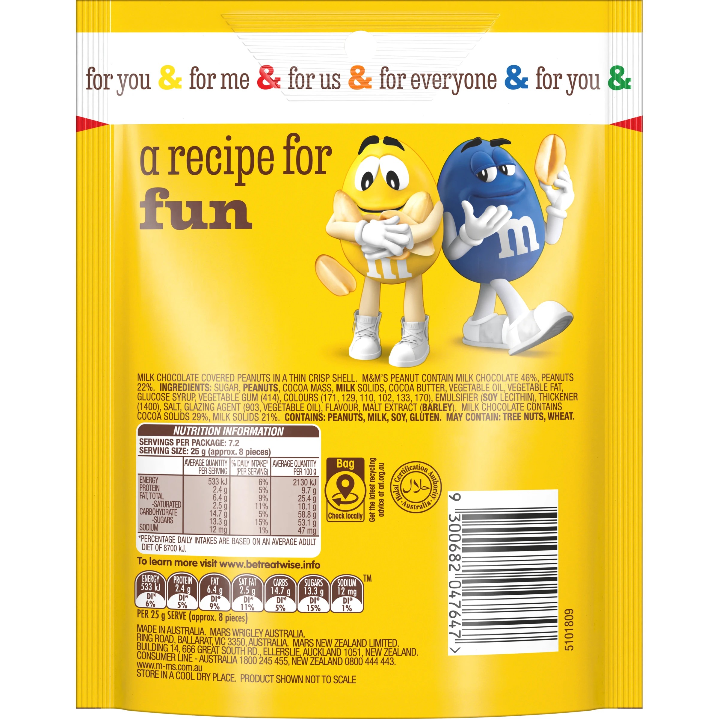 Call off the search! Because those deliciously fun bite-size chocolate snacks you’ve been looking for are right here in this share pack of M&M’s peanut Chocolate legends! These mouthwatering M&M’s Milk Chocolate covered peanuts in thin crisp shells have been sending chocolate lovers nuts across the globe since 1954. That’s because these chocolate treats make the perfect screen-time chocolate snacks, whether you're sharing them as movie night chocolate treats or enjoying them when you stream your favourite shows. For something different, why not try sprinkling their happy M&M's peanut Chocolate colours into baking recipes, popcorn TV snacks or even banana splits! Did you know that M&M’s Chocolates were the first lollies to rocket into space? So for chocolate snacks that are literally out of this world, grab this bag of scrumptious M&M’s Chocolates! Party at your place? It starts with M&M’s peanut Chocolates.