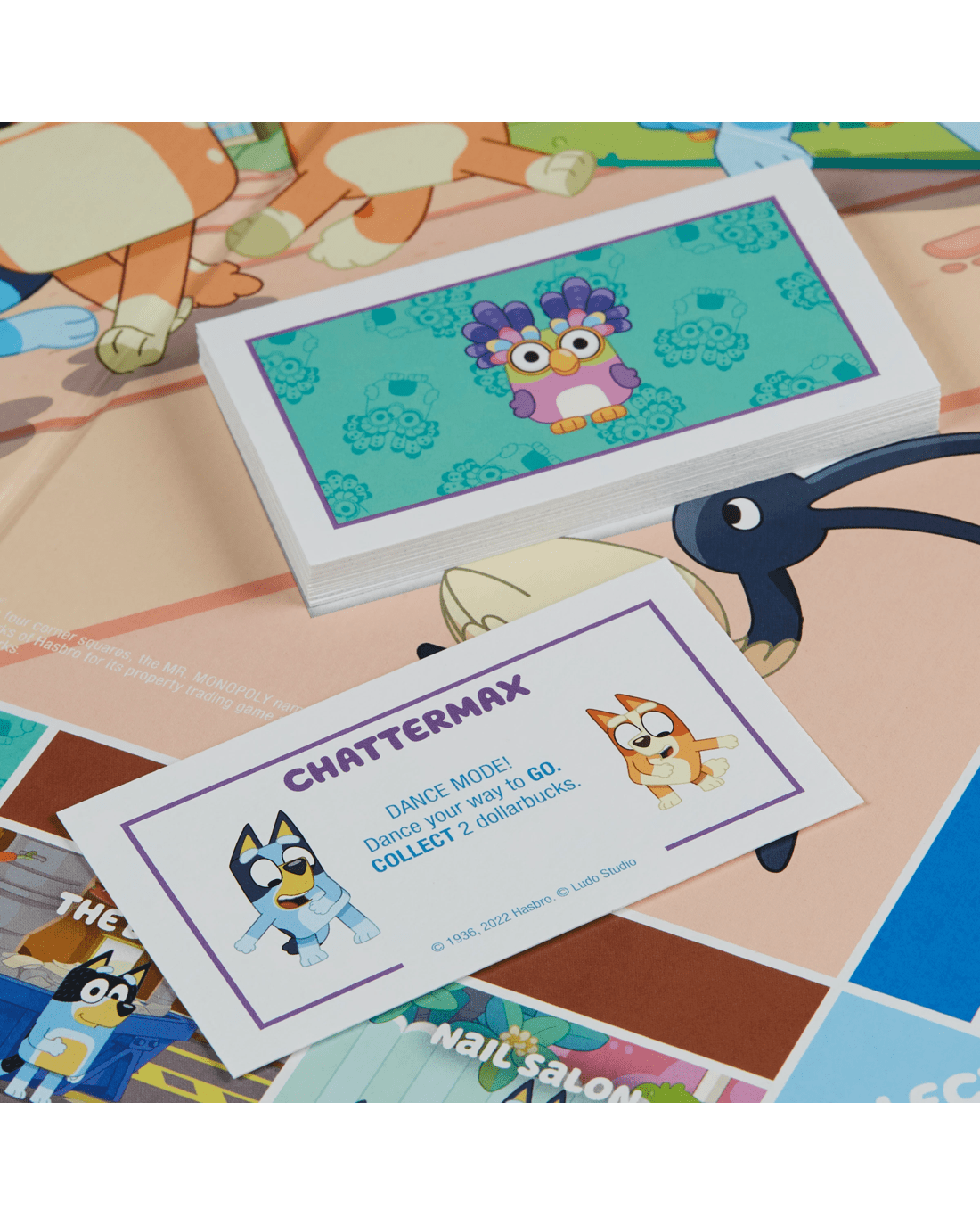 - Bluey themed gameboard: The properties on the gameboard feature familiar locations that Bluey fans will recognise such as Bluey's House, The Dump, Uncle Stripe's Pool, Rug Island and the Nail Salon
