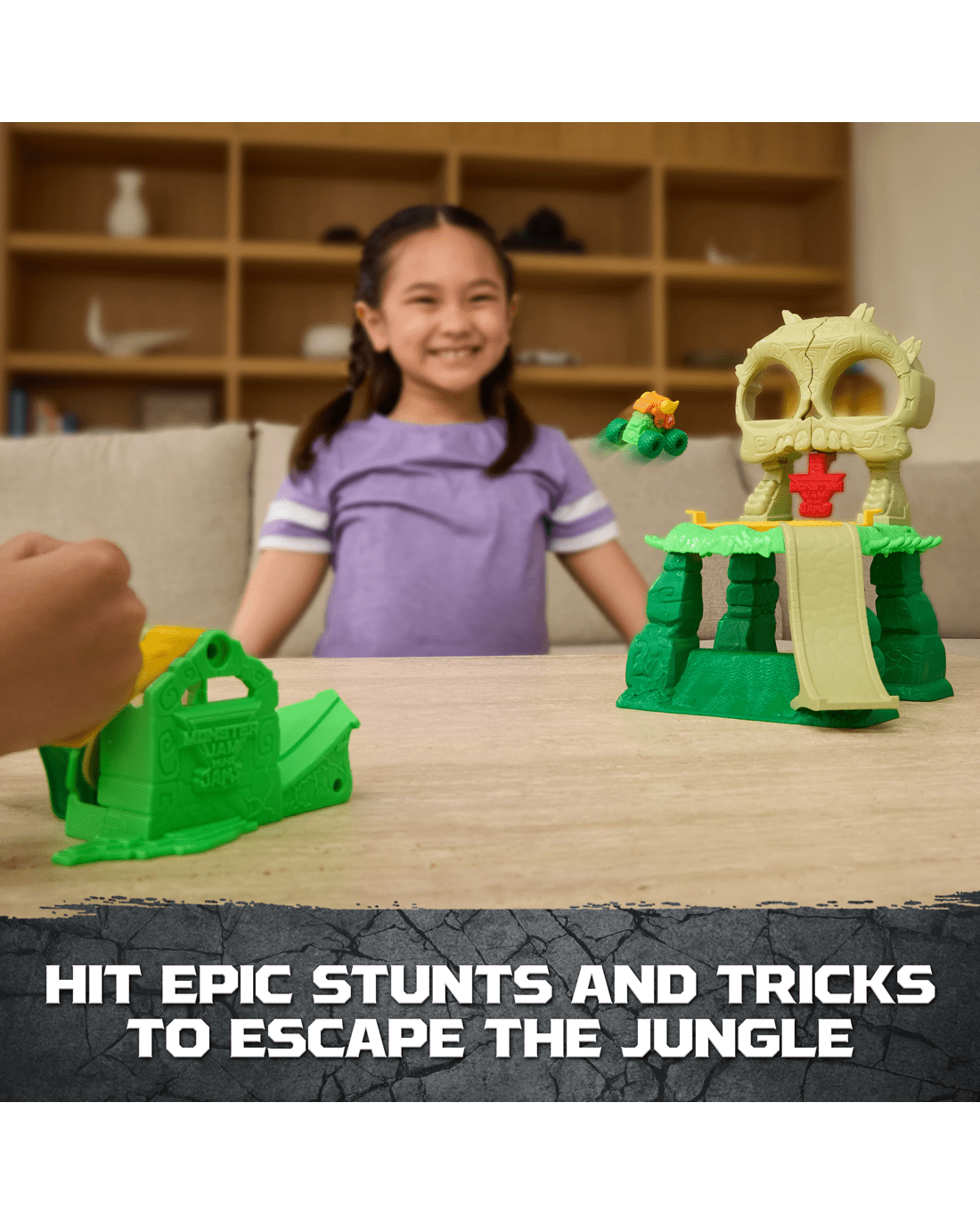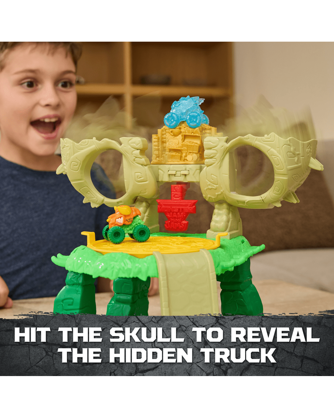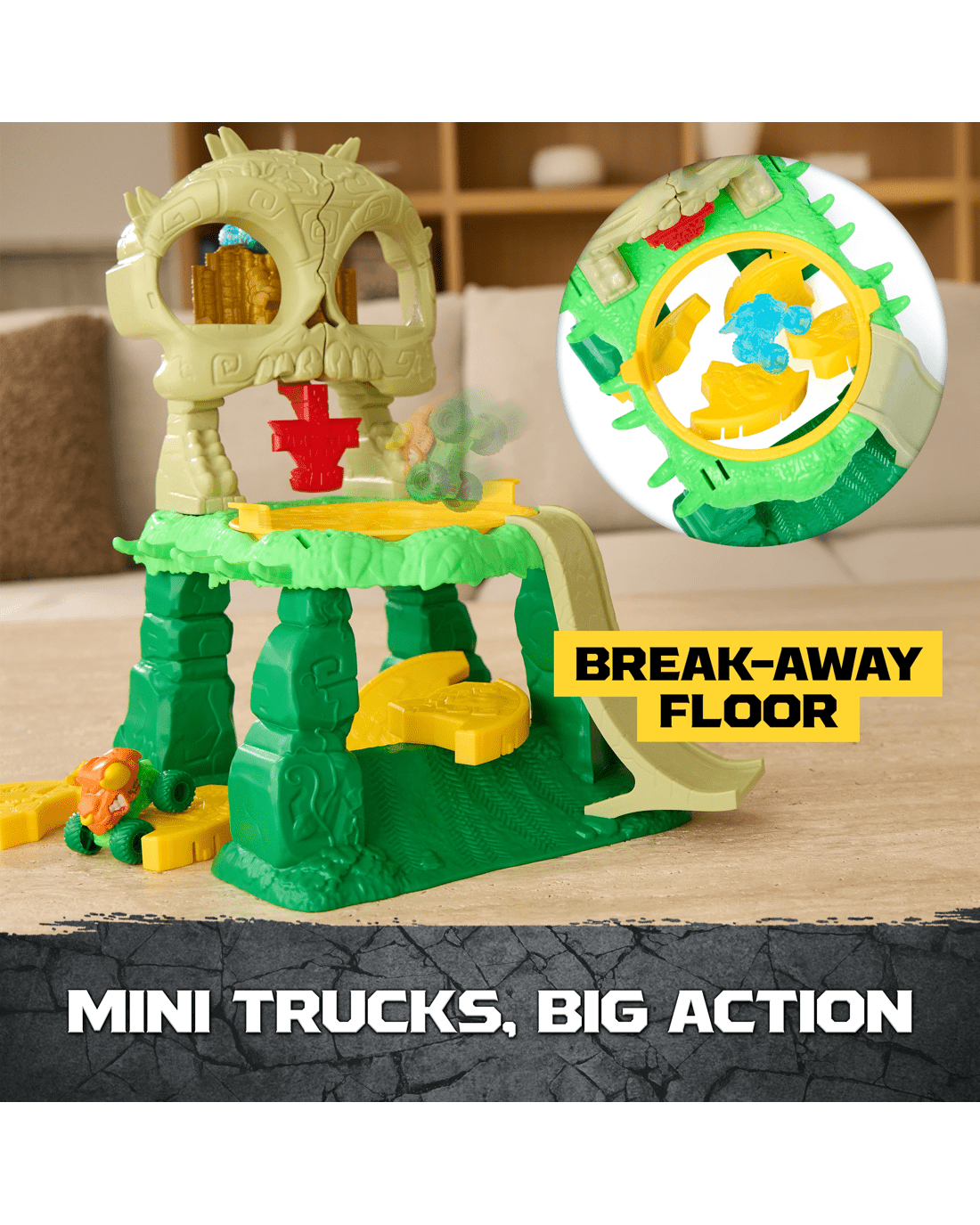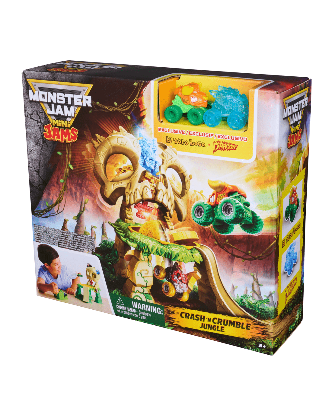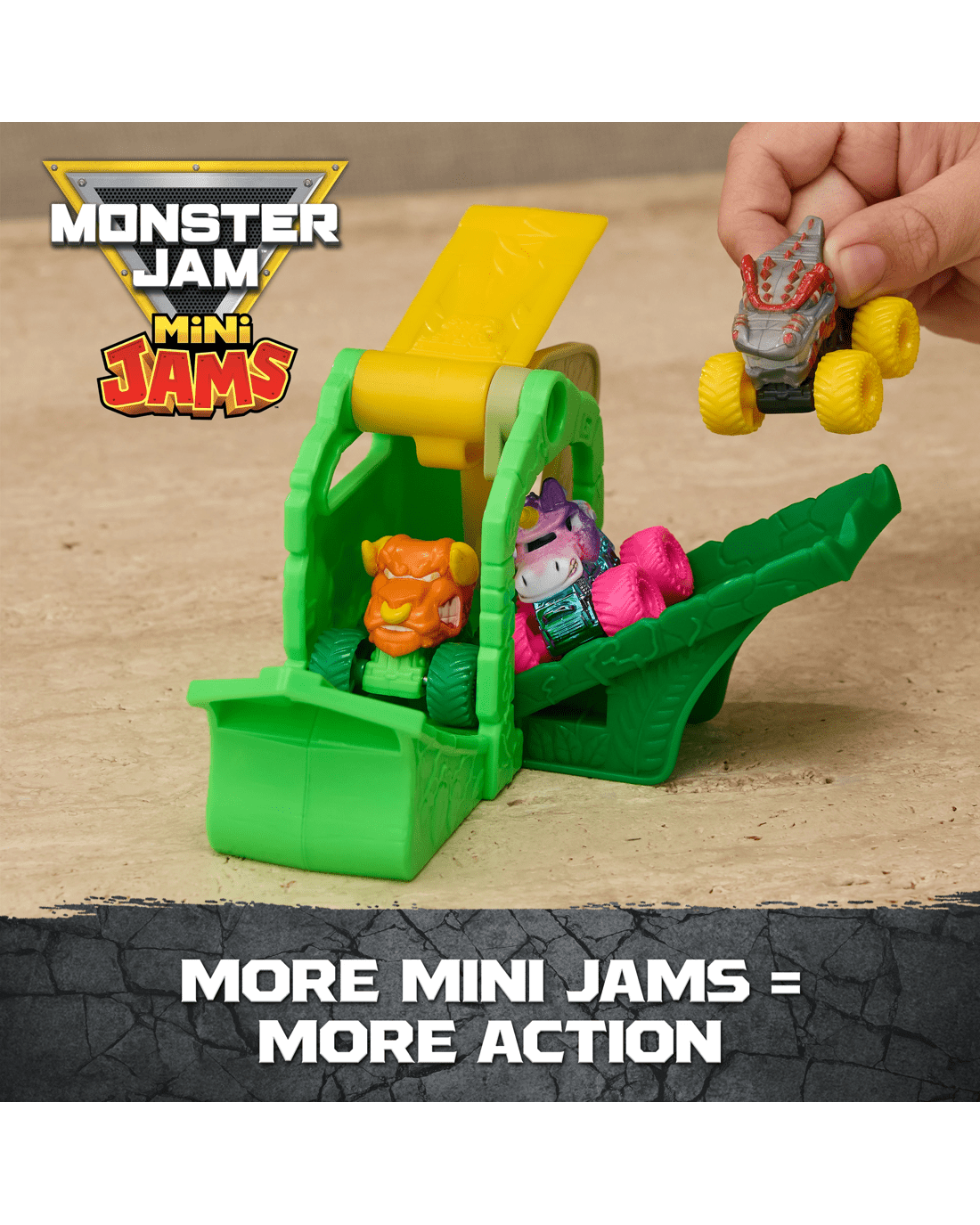 - Mini Jams Jungle Adventure: Launch into wild Monster Jam mayhem, use the launcher to send your Mini Monster Trucks flying into the giant skull and escape the jungle!