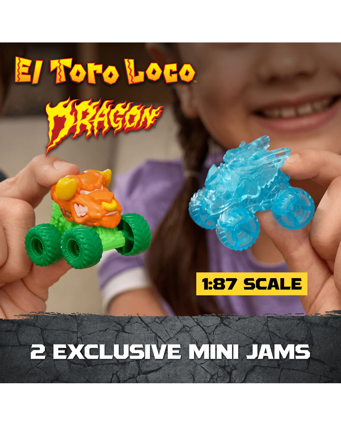 - 2 Exclusive Mini Jams: Unleash the power of Dragon and El Toro Loco in 1:87 scale, featuring epic gem-themed designs and fierce Monster Jam styling