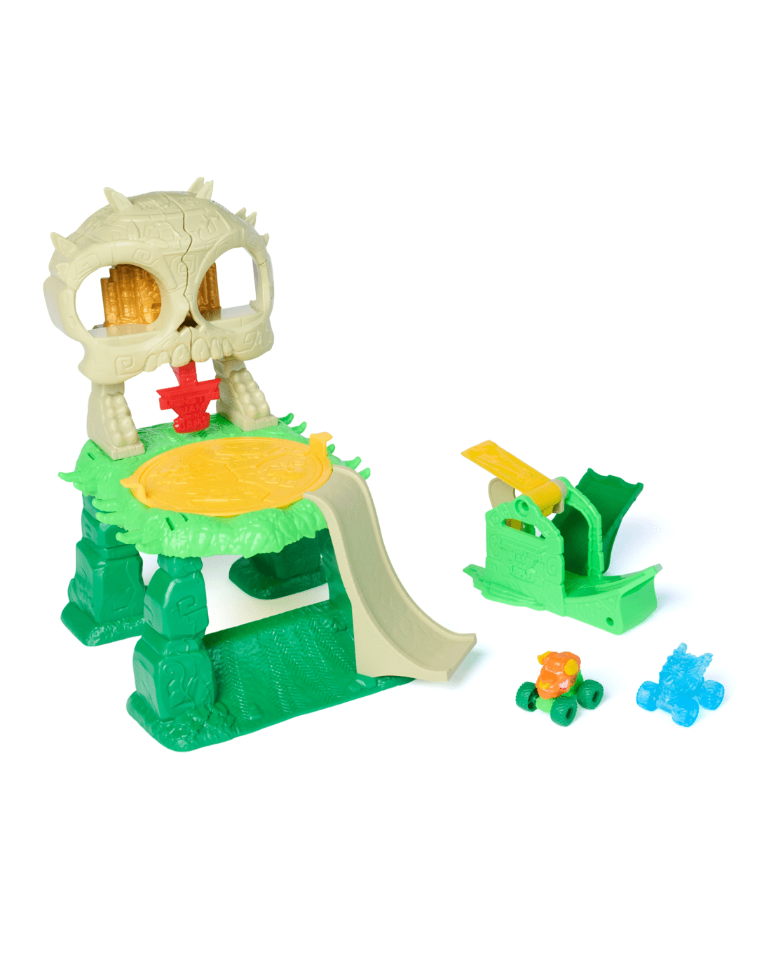 Launch into chaos with the Monster Jam, Crash & Crumble Skull Escape Playset. Rev up and fly into action with two exclusive Mini Jam trucks, Dragon and El Toro Loco, with gem-themed details. This playset delivers endless excitement as you load your trucks into the launcher. How many trucks can you load into this playset? The more trucks you add, the more action you bring! Watch as your trucks fly and crash into the skull on the top platform of this playset. Hit the skull at just the right place with your monster truck toys to escape the jungle. With so many other Monster Jam trucks to collect, add Grave Digger, Max-D, El Toro Loco and more (each sold separately) to your collection and race them all! Monster Jam toys, like remote control cars and more to bring the excitement home. Bring the action with the Monster Jam Skull Escape playset.