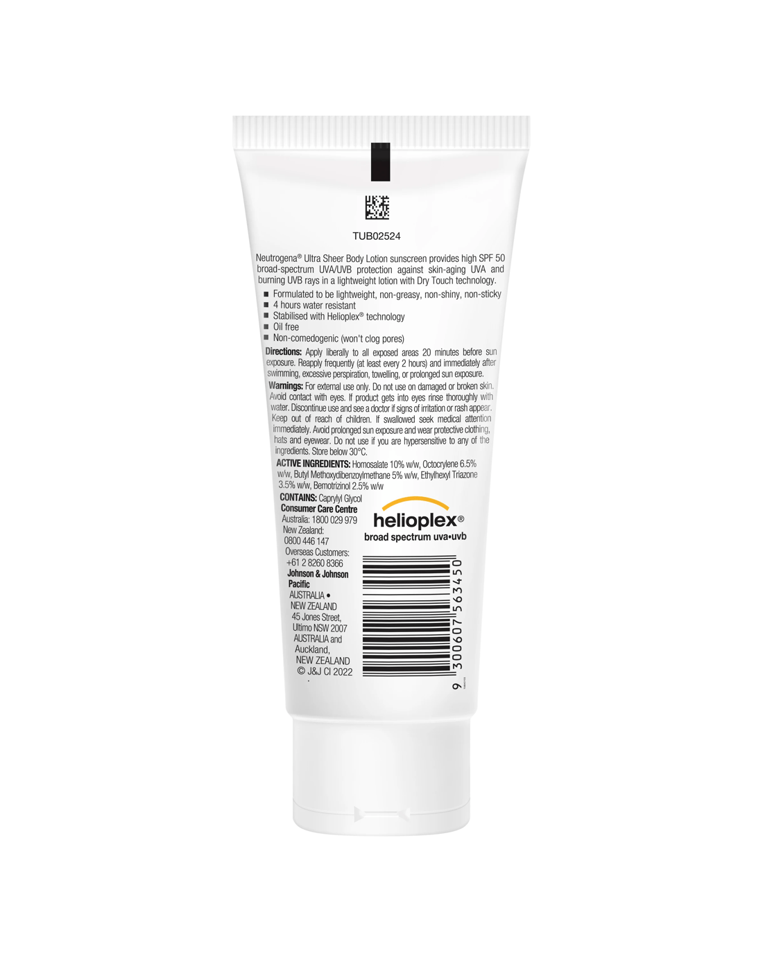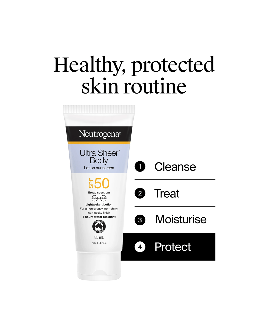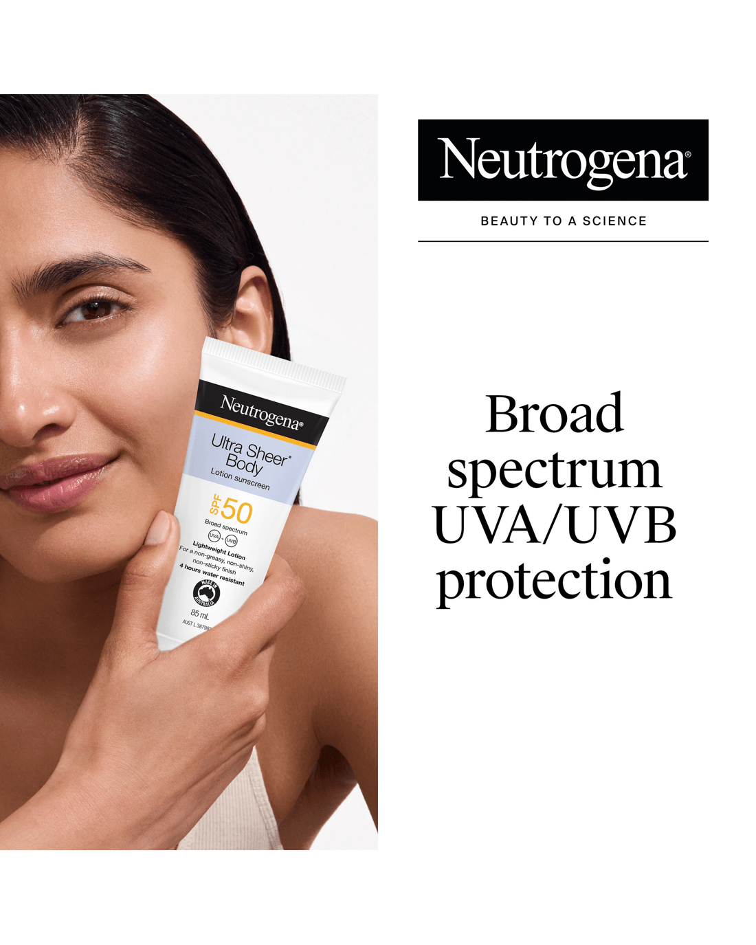 Neutrogena® Ultra Sheer Body Lotion sunscreen high SPF 50 broad-spectrum UVA/UVB protection against skin ageing UVA and burning UVB rays in a lightweight lotion with Dry Touch technology.