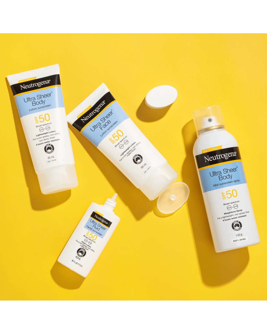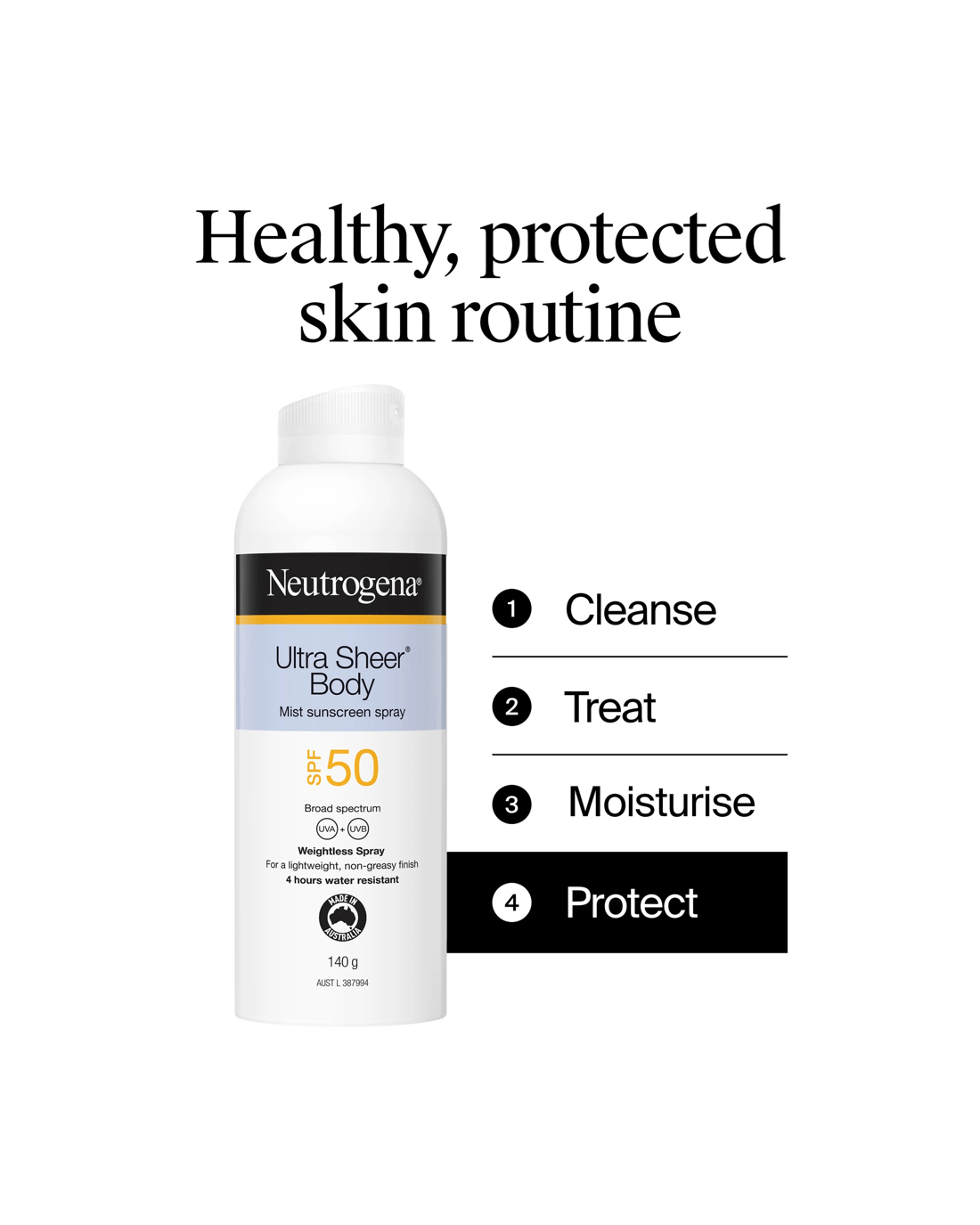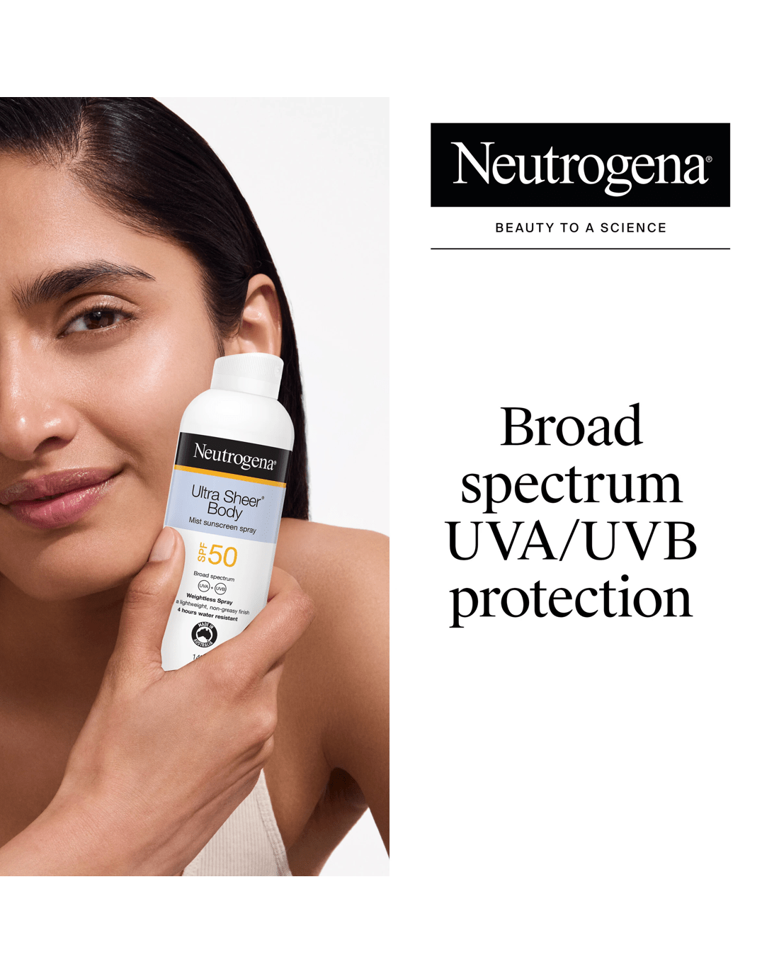 Neutrogena® Ultra Sheer Body Mist Sunscreen provides high SPF 50 broad-spectrum UVA/UVB protection against skin aging UVA and burning UVB rays in a lightweight lotion with Dry Touch technology.