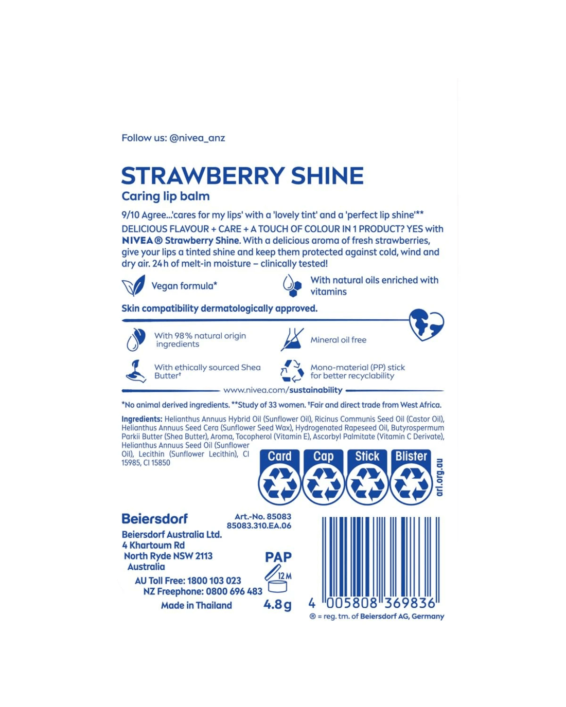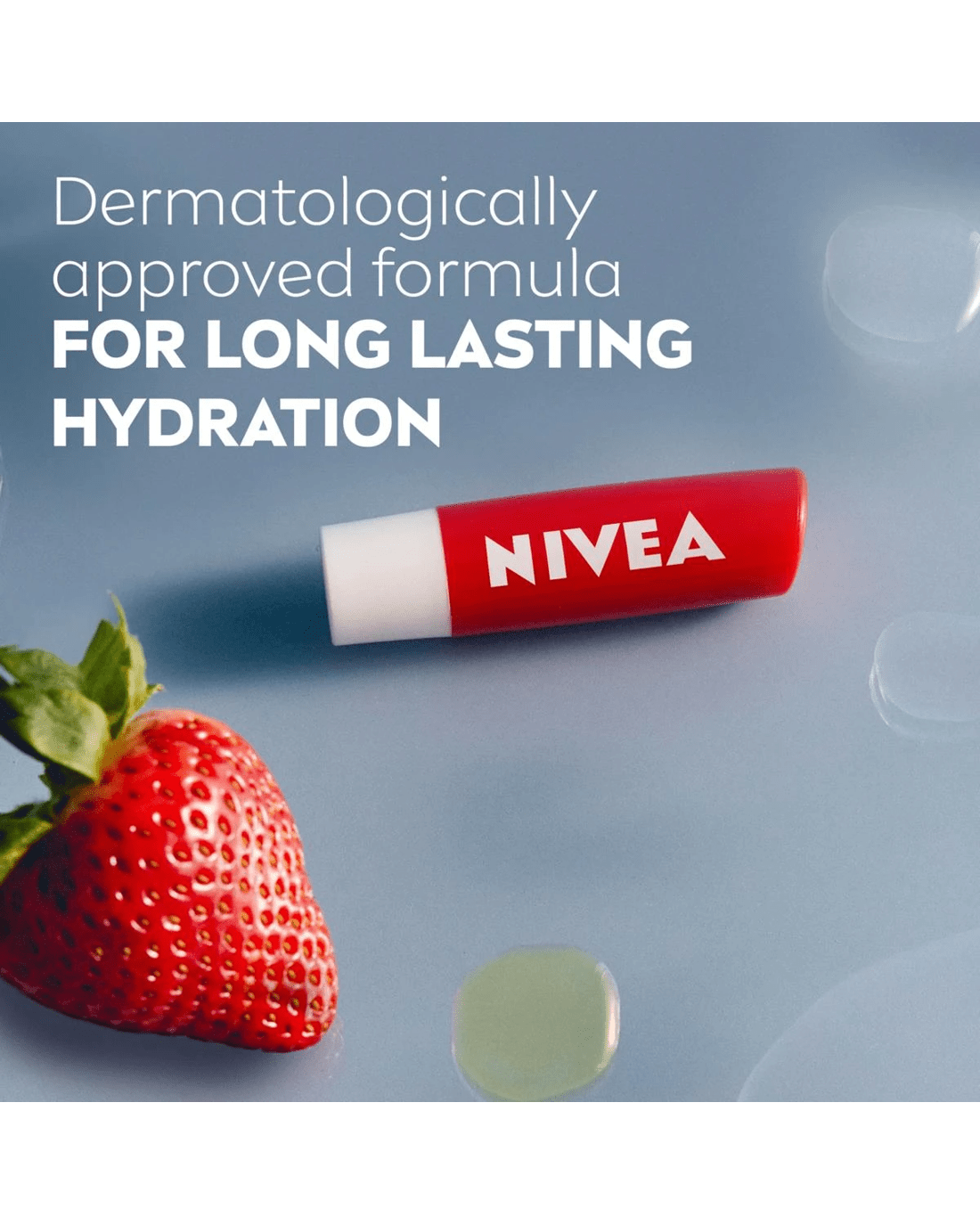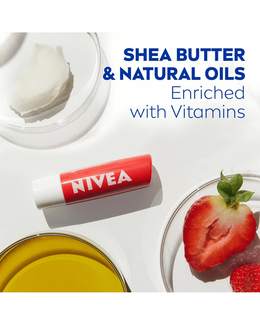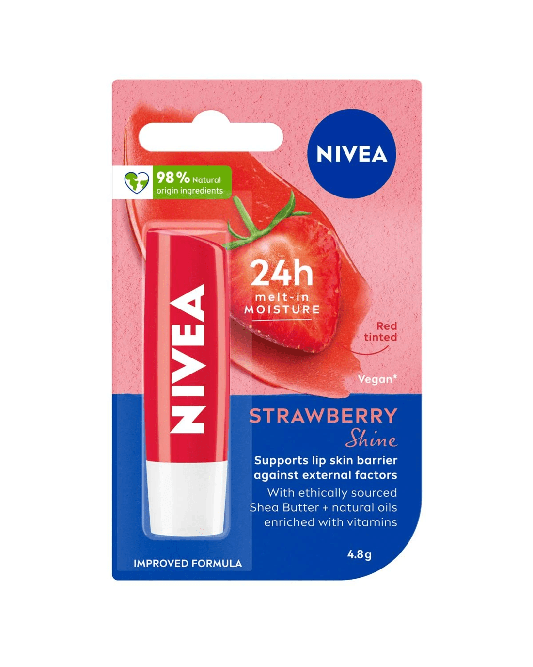 Care for your lips with Nivea Strawberry Shine Caring Lip Balm! The soft balm provides you with a delicious strawberry aroma and a subtle pink shine. The unique formula enriched with natural oils instantly melts into your lips and keeps them moisturised for 24 hours*. It glides on evenly and easily so that no mirror is required! For a beautiful touch of shiny colour and soft, kissable lips; all day, every day. Stay protected and hydrated effortlessly, all day, with Nivea Strawberry Shine. The skin compatibility of this caring lip balm has been dermatologically approved.