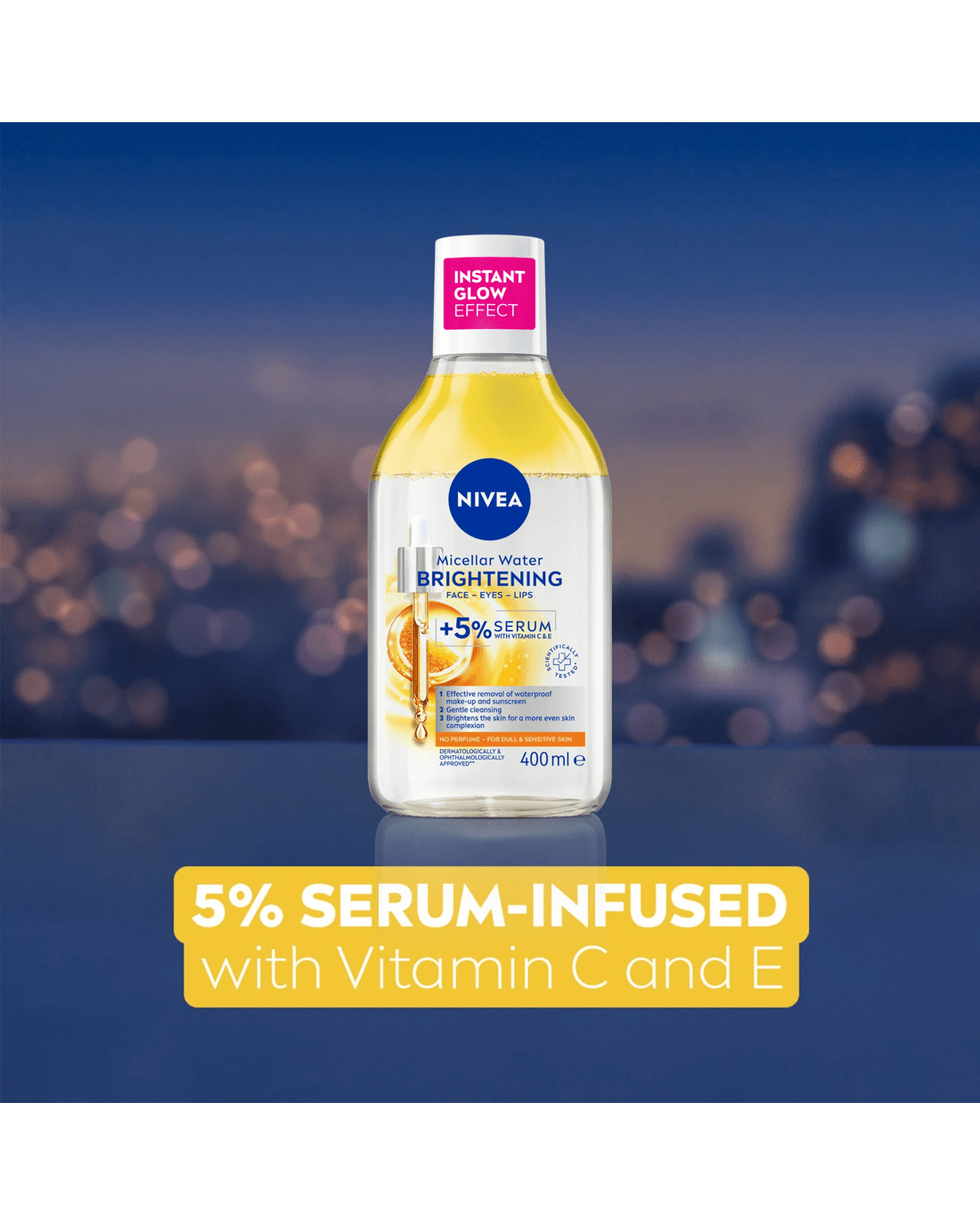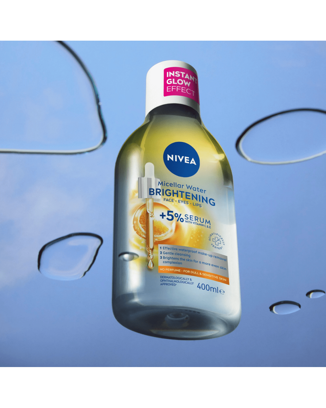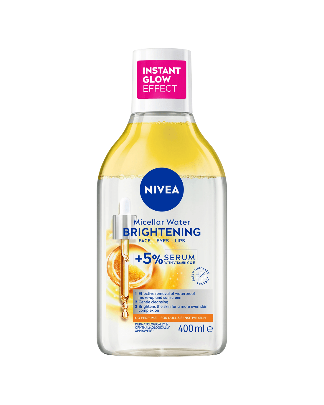 Discover the ultimate skincare routine with Nivea Brightening Micellar Water. Nivea Brightening Micellar Water for dull and sensitive skin is enriched with Amino Acid Complex and 5% Serum with Vitamin C & E. It removes waterproof make-up, impurities and dirt with just a few featherlight swipes, leaving no greasy residue. No rubbing is needed, therefore it cleanses the skin very gently, avoiding irritation. It brightens, revitalises and hydrates the skin for a more even and smooth skin complexion. The brightening effect is scientifically tested. The brightening formula does not contain perfume and its skin and eye compatibility is dermatologically and ophthalmologically approved.