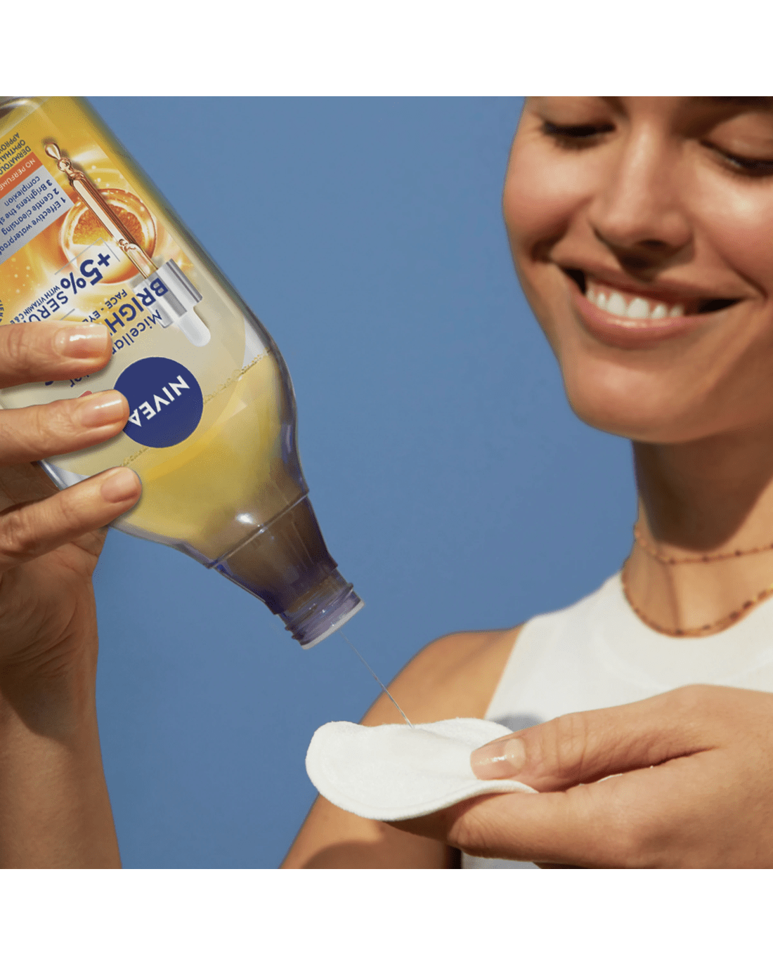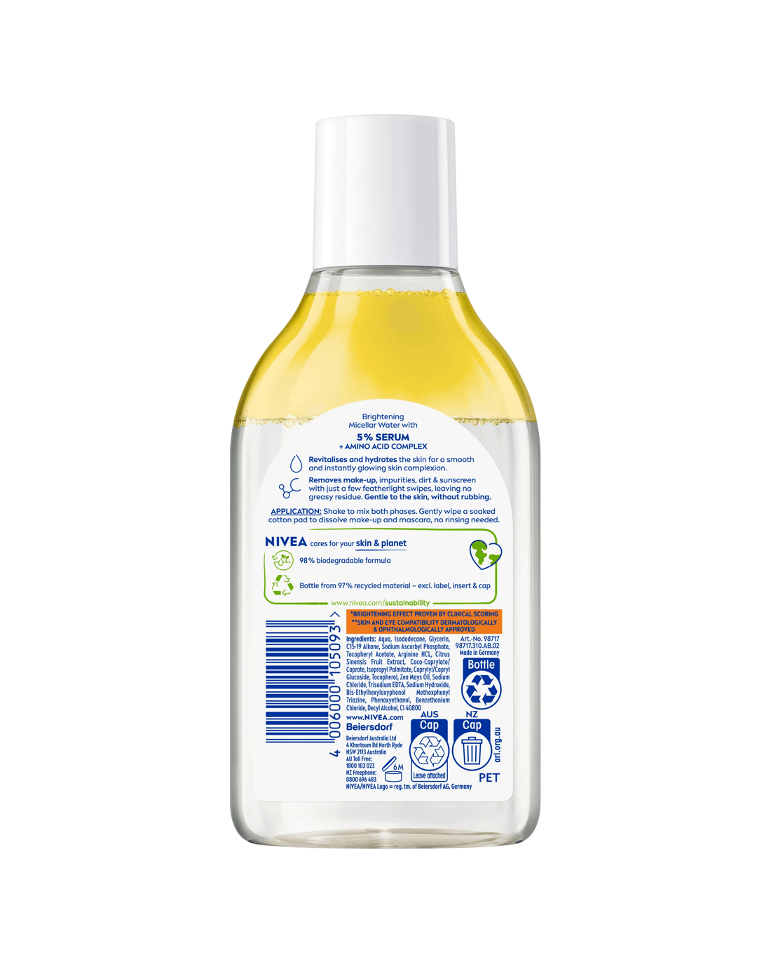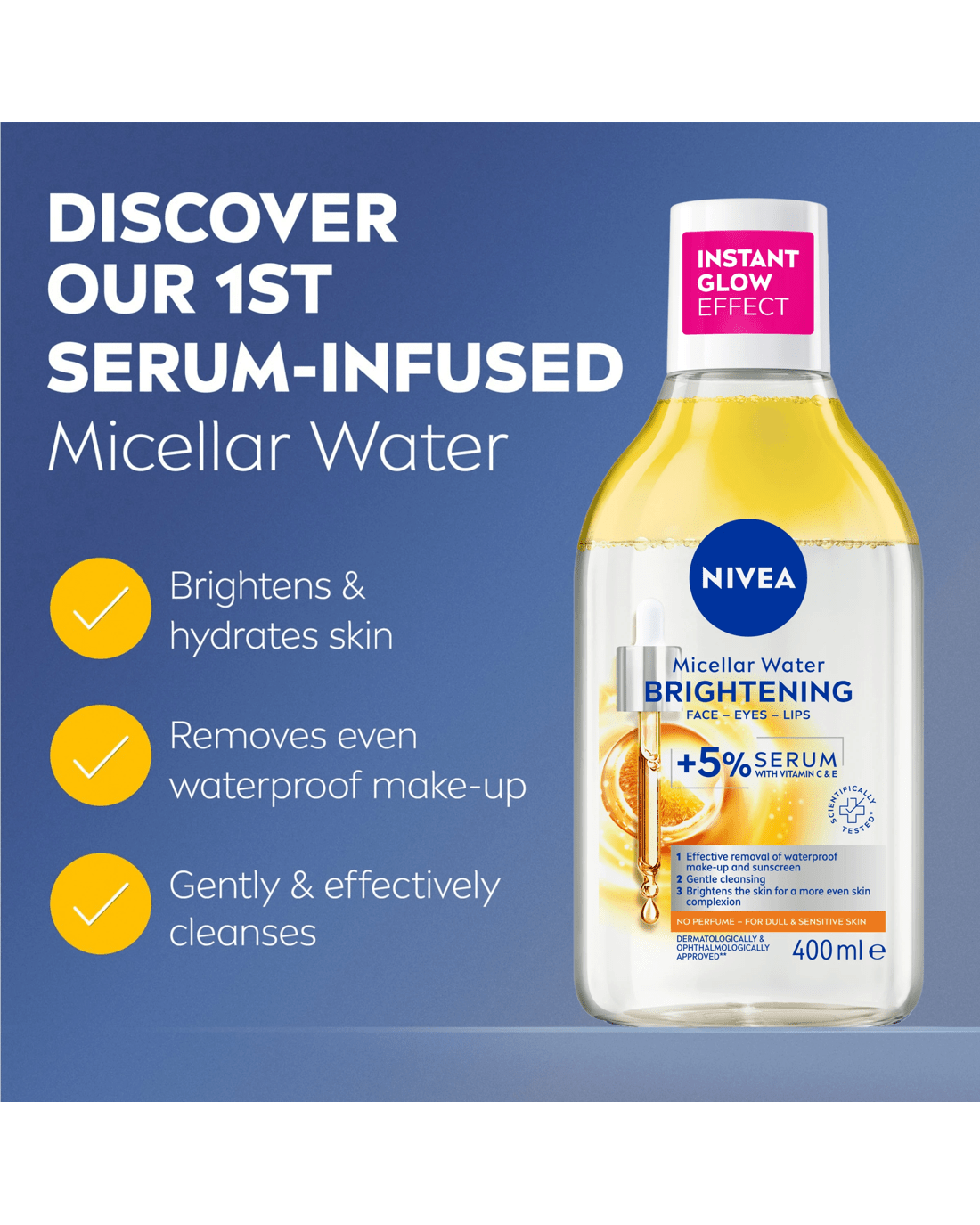 Discover the ultimate skincare routine with Nivea Brightening Micellar Water. Nivea Brightening Micellar Water for dull and sensitive skin is enriched with Amino Acid Complex and 5% Serum with Vitamin C & E. It removes waterproof make-up, impurities and dirt with just a few featherlight swipes, leaving no greasy residue. No rubbing is needed, therefore it cleanses the skin very gently, avoiding irritation. It brightens, revitalises and hydrates the skin for a more even and smooth skin complexion. The brightening effect is scientifically tested. The brightening formula does not contain perfume and its skin and eye compatibility is dermatologically and ophthalmologically approved.