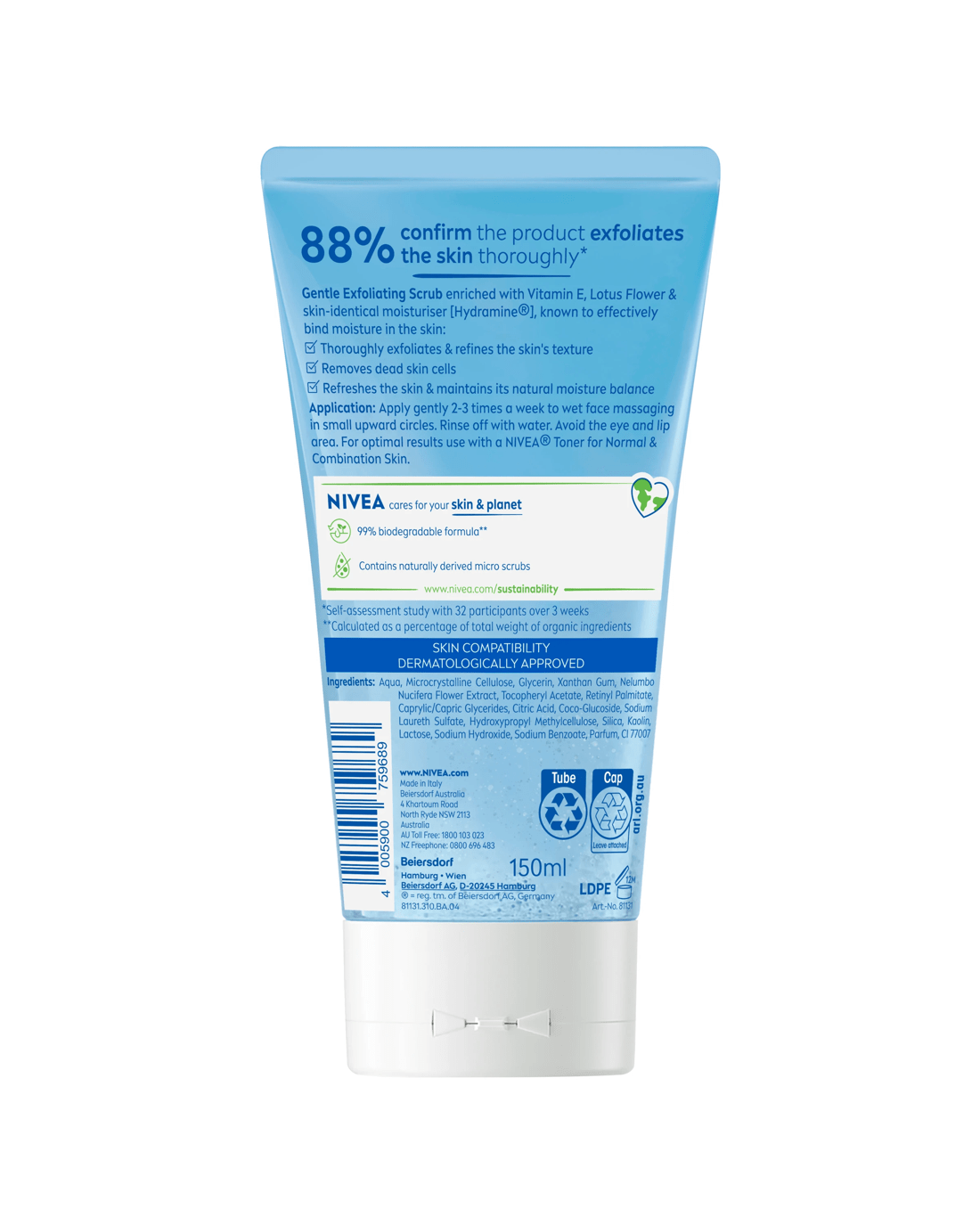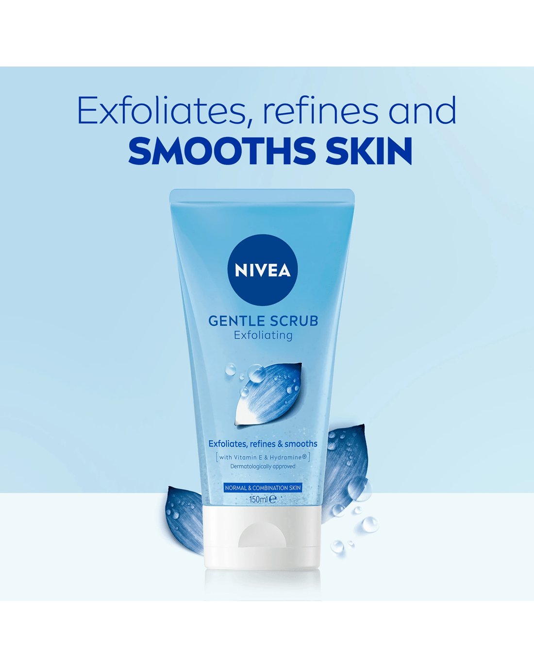 Nivea Gentle Exfoliating Scrub with Lotus Flower, Vitamin E and Hydramine® – so your skin gets the best care you deserve! These ingredients work to deeply and gently exfoliate your skin whilst cleansing. The formula is made from naturally derived micro scrubs that work to refine the skin texture and refresh your skin whilst maintaining its natural moisture balance. The application is simple: Simply apply the scrub to your wet face, avoiding the eye and lip area. Afterwards, rinse it off with water. Enjoy the scrub two to three times a week. The skin compatibility of this face scrub has been dermatologically and ophthalmologically approved.