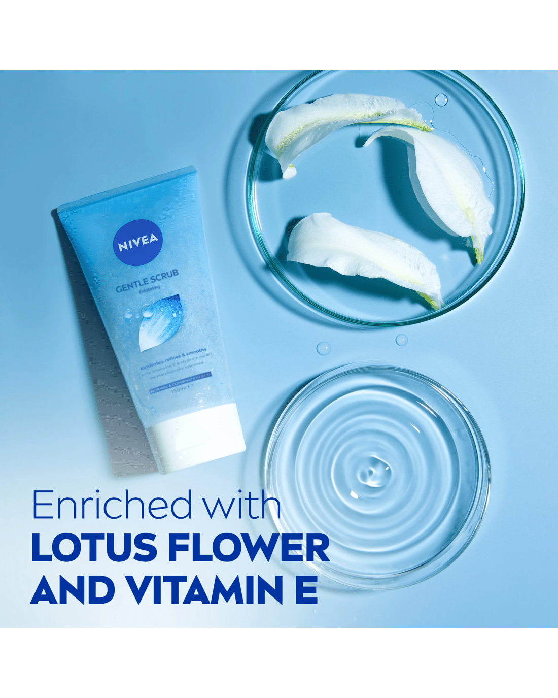 - Gentle Exfoliating Scrub enriched with Vitamin E, Lotus Flower and skin-identical moisturiser Hydramine®, known to effectively bind moisture in the skin: