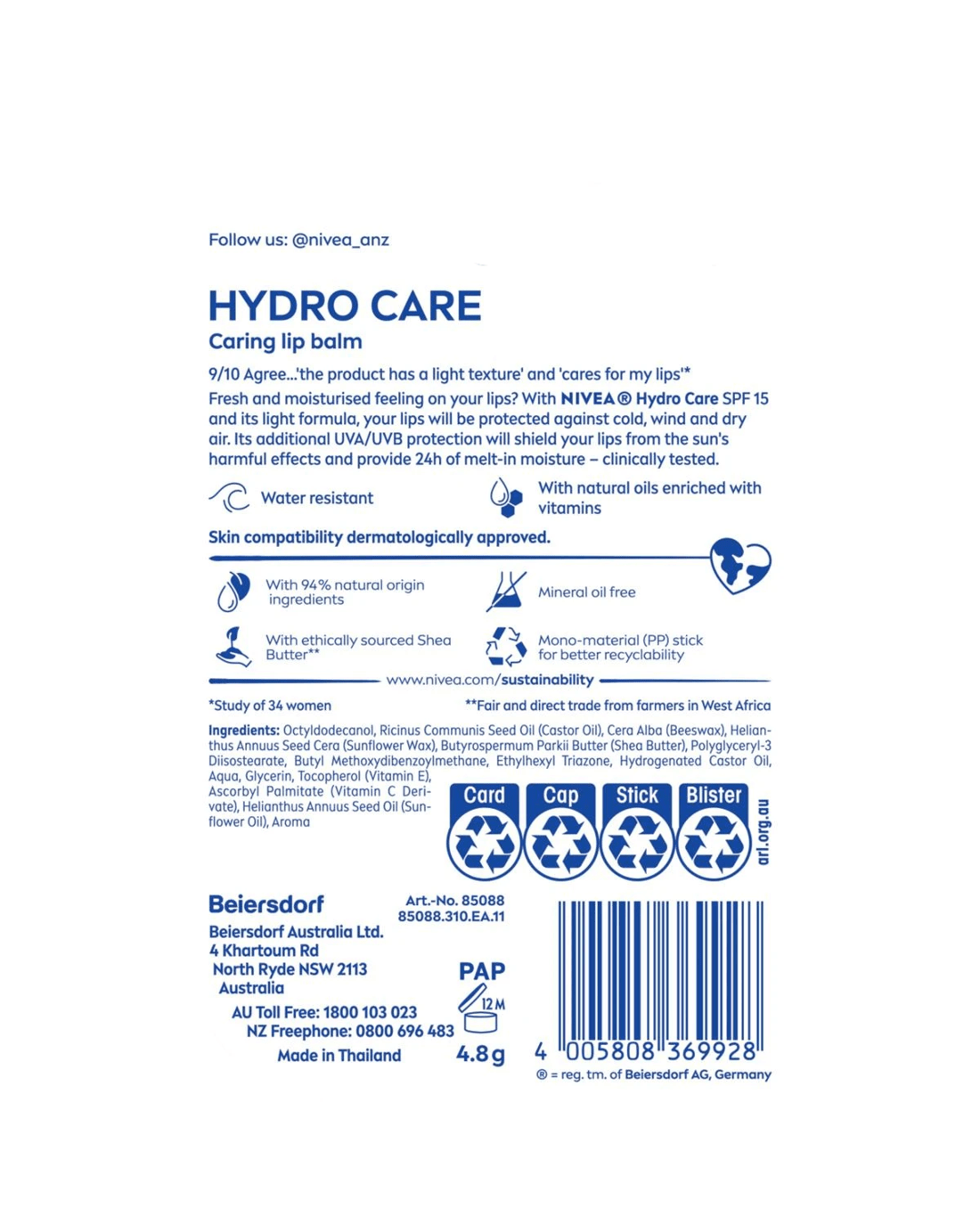 Nivea Hydro Care Lip Balm 4.8g