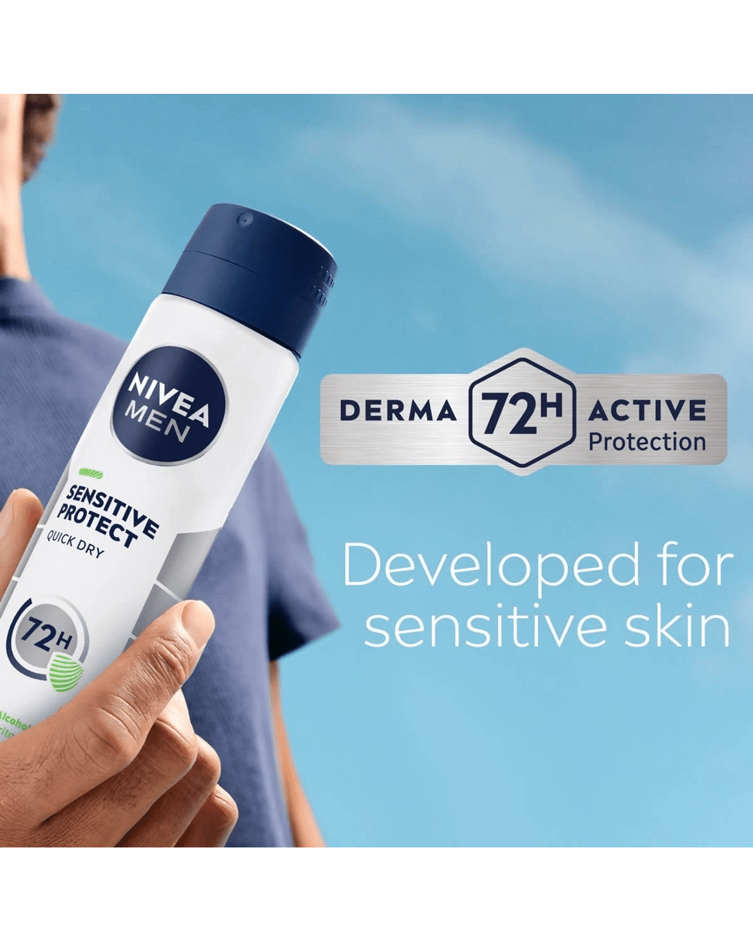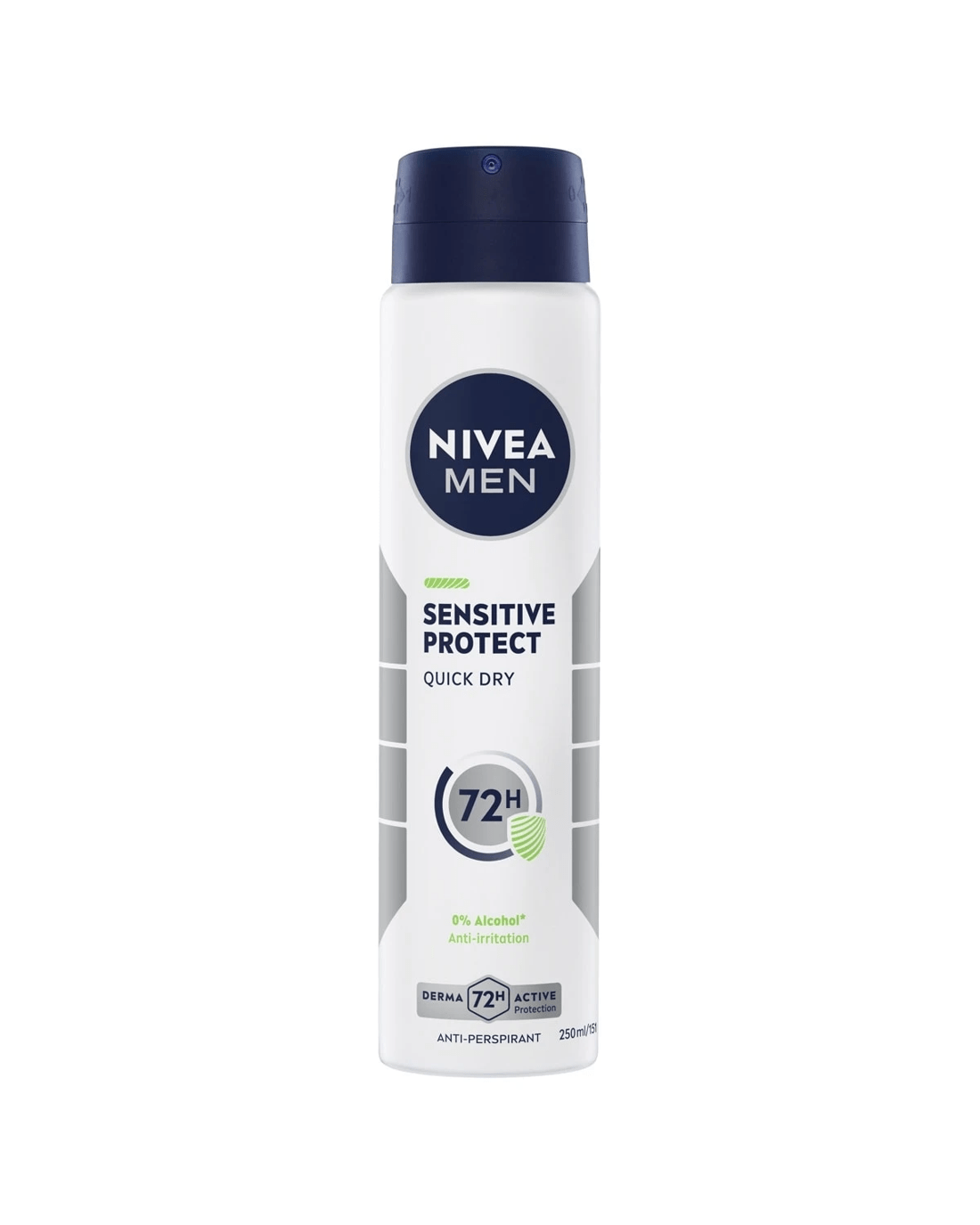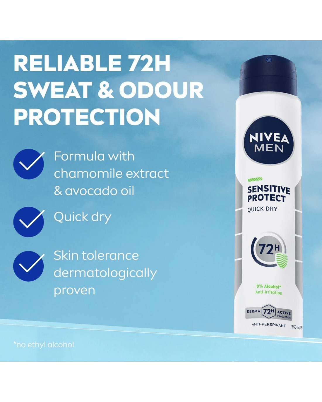 Nivea Men Sensitive Protect Anti-Perspirant Aerosol offers 5-fold protection against odour, sweat, burning, itchiness and signs of dry skin for boost of comfort. Its mild formula with chamomile extract and avocado oil, helps to prevent skin irritation and provides gentle care. The formulas are also skin tolerance dermatologically proven, specially developed for sensitive skin and do not contain ethyl alcohol. Offer Derma 72h Active protection: our products are working with the skin, for reliable and strong efficacy against sweat and odour and with kind-to-skin formulations. Get the reliable protection and care that you deserve! Also available in a roll-on format.