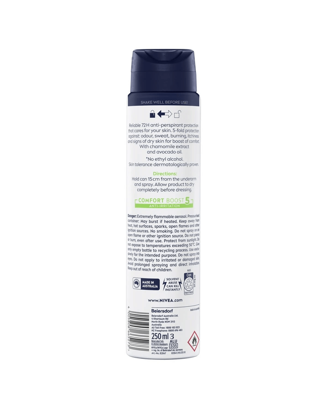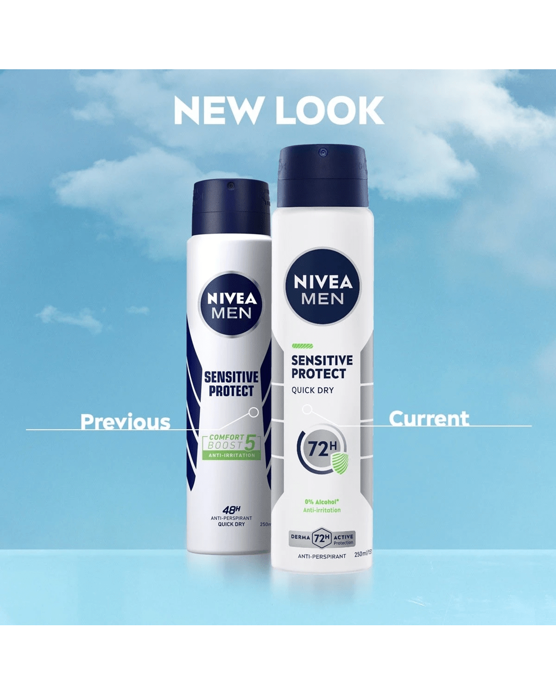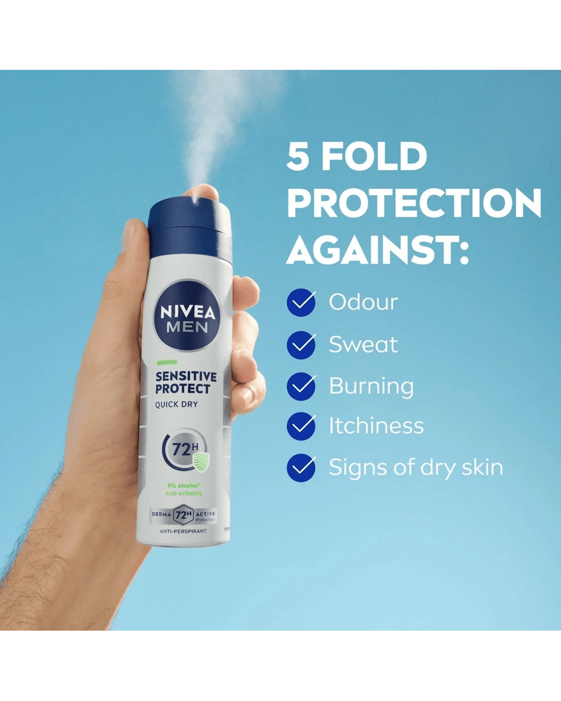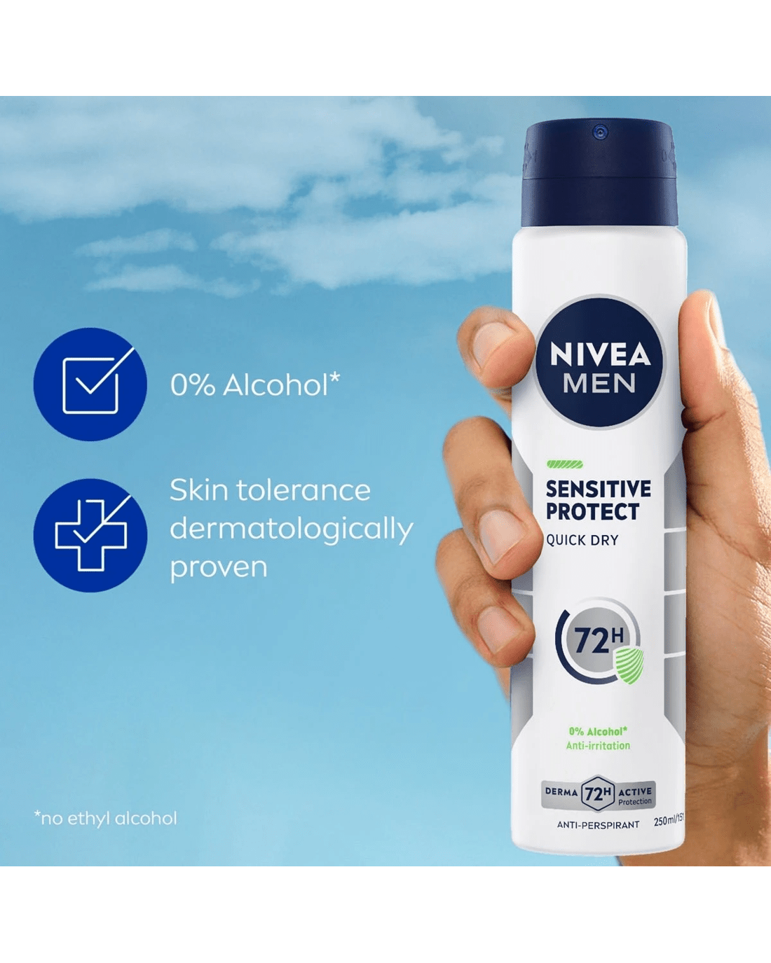 Nivea Men Sensitive Protect Anti-Perspirant Aerosol offers 5-fold protection against odour, sweat, burning, itchiness and signs of dry skin for boost of comfort. Its mild formula with chamomile extract and avocado oil, helps to prevent skin irritation and provides gentle care. The formulas are also skin tolerance dermatologically proven, specially developed for sensitive skin and do not contain ethyl alcohol. Offer Derma 72h Active protection: our products are working with the skin, for reliable and strong efficacy against sweat and odour and with kind-to-skin formulations. Get the reliable protection and care that you deserve! Also available in a roll-on format.