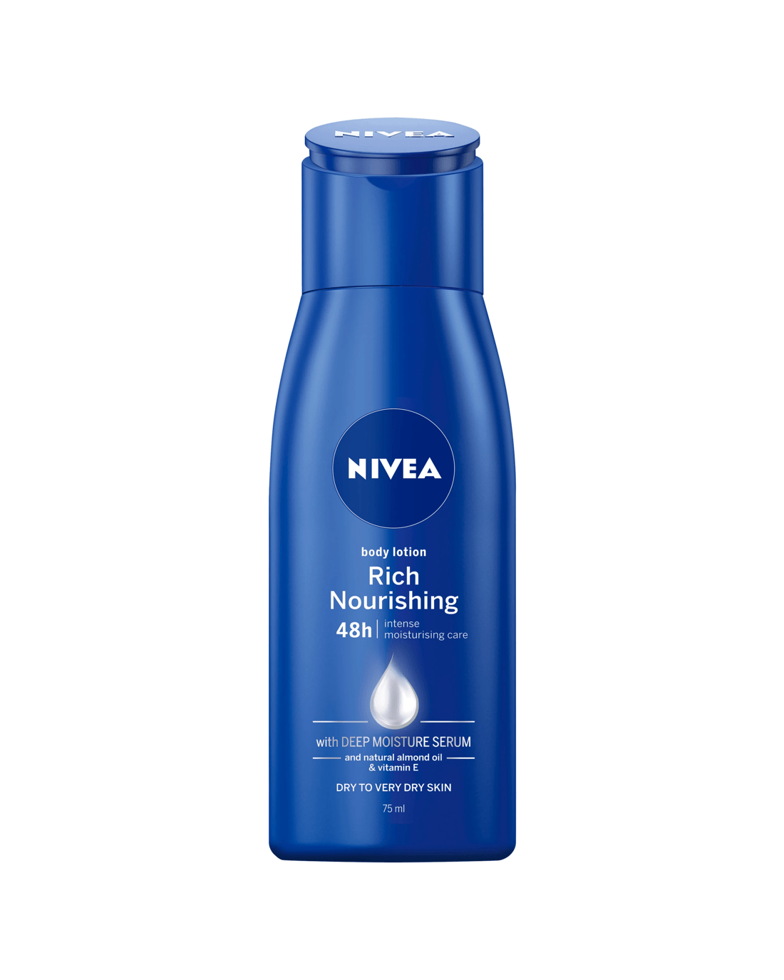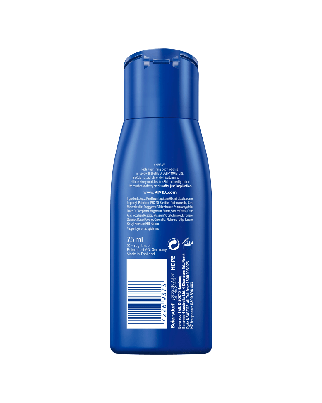Nivea Rich Nourishing Body Lotion with Natural Almond Oil and Vitamin E provides 5 in 1 complete care for your skin. With 48 hour deep moisture due to its unique composition of skin's own moisturiser, moisture-locking lipids and care providing oils that work together to bind and hold water in the skin. This means that the moisture cannot evaporate easily into the surrounding areas, absorbing fast whilst leaving you with a smooth skin feel. Skin is well protected from drying out, because water loss is reduced and the moisture level of the skin is increased, giving you the indulgent care you deserve. With the perfect combination of quality ingredients in our body lotions together with Nivea Deep Moisture Serum penetrates deeply into the skin, locking moisture and providing deep* moisture for 48h.
