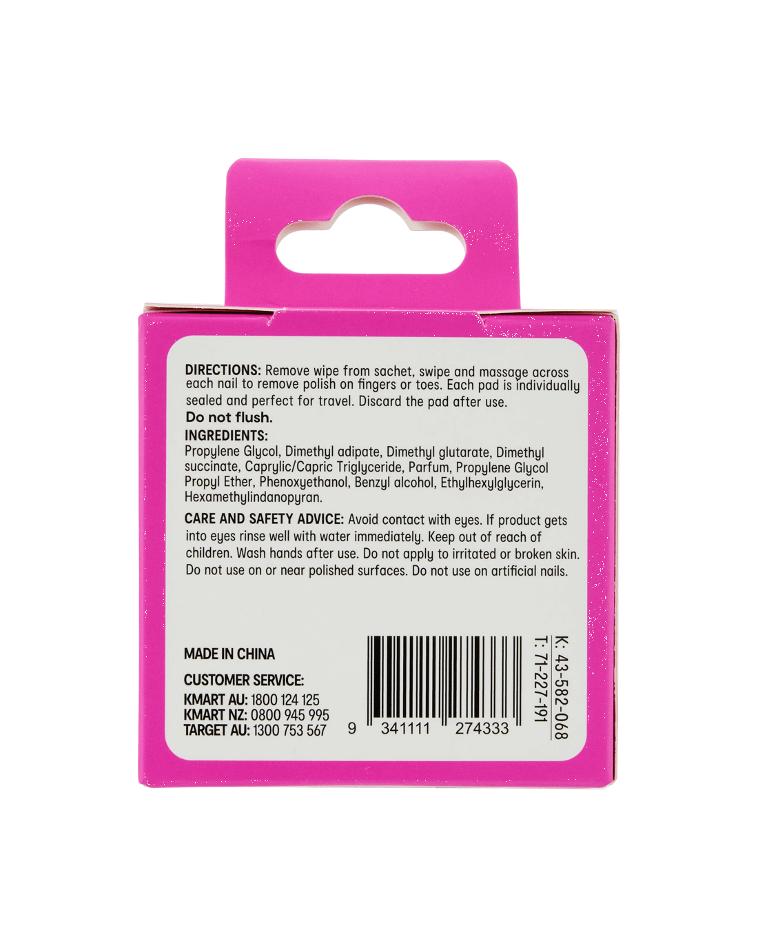 - Directions for use: Remove wipe from sachet, swipe and massage across each nail to remove polish on fingers or toes. Each pad is individually sealed and perfect for travel. Discard the pad after use