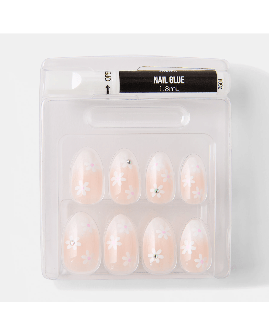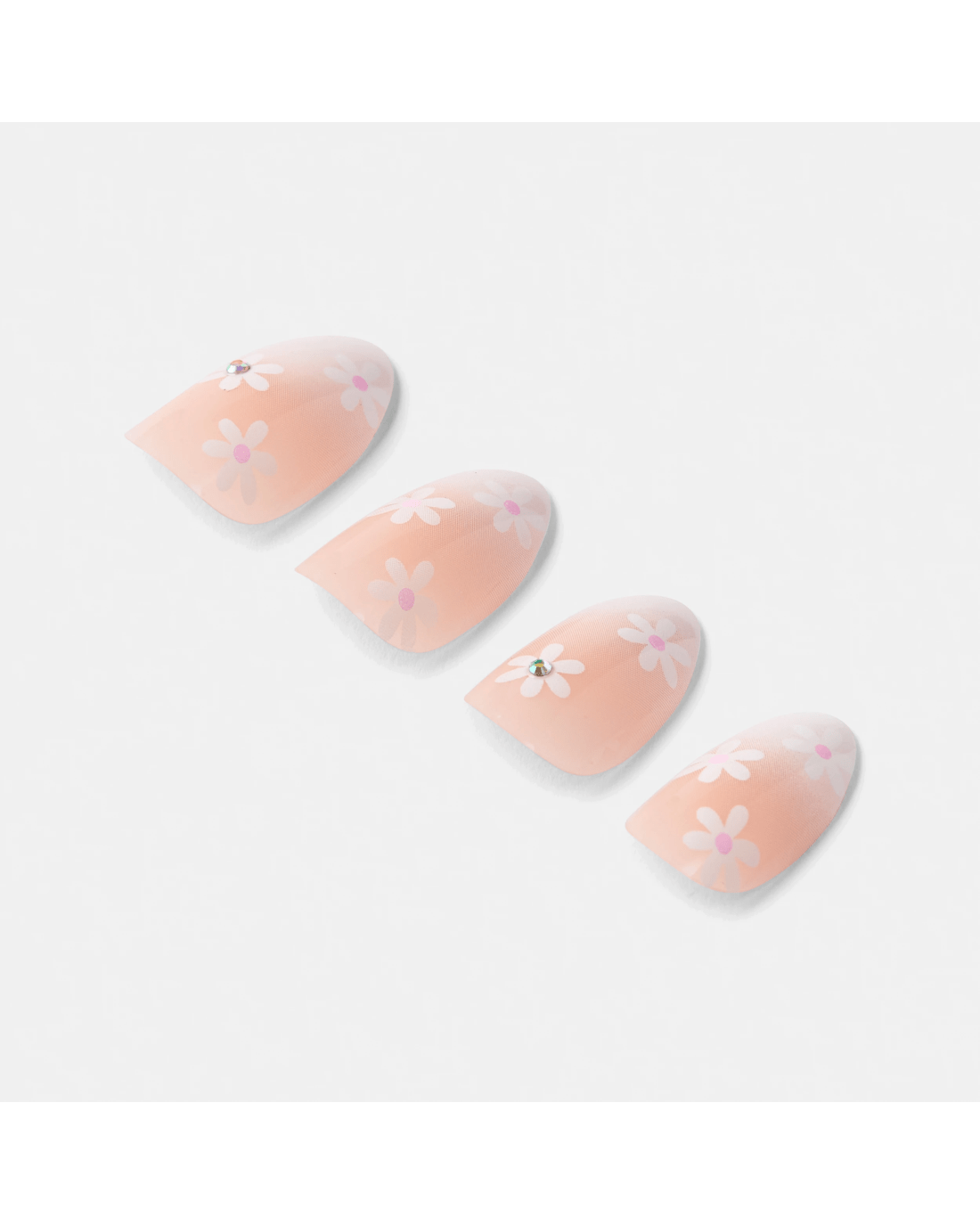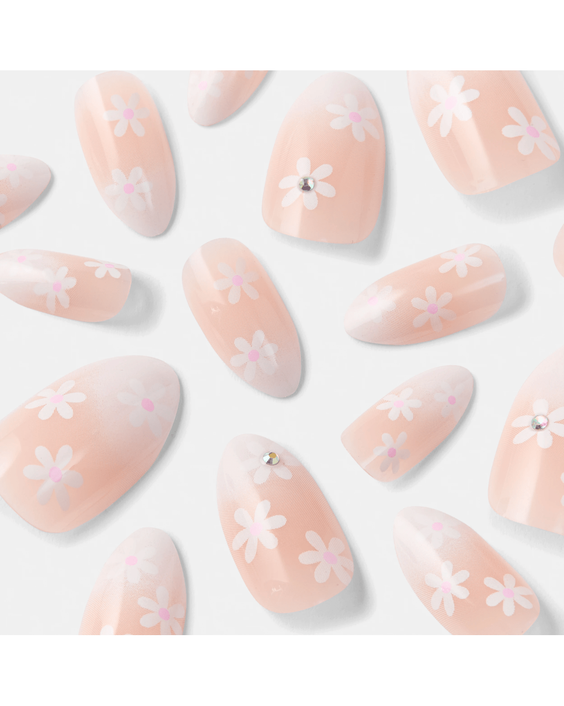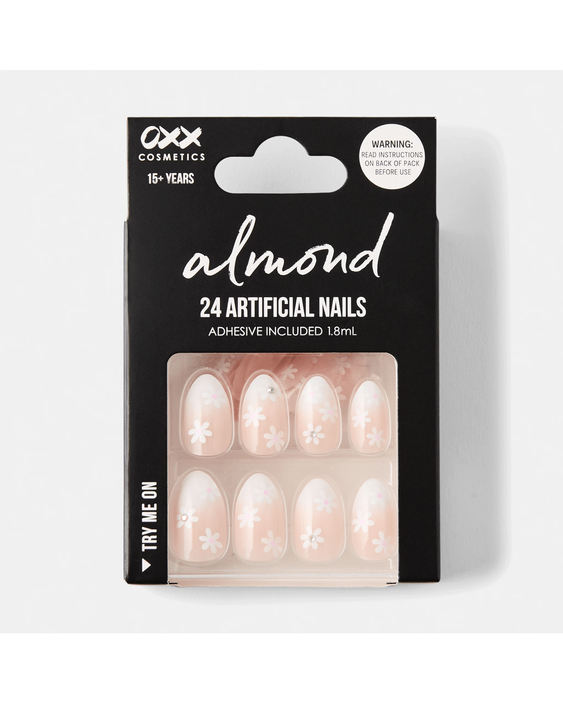 Enhance your nails with the OXX Cosmetics 24 Pack Artificial Nails. These almond-shaped nails are adorned with delicate flowers and gems, perfect for a touch of elegance.