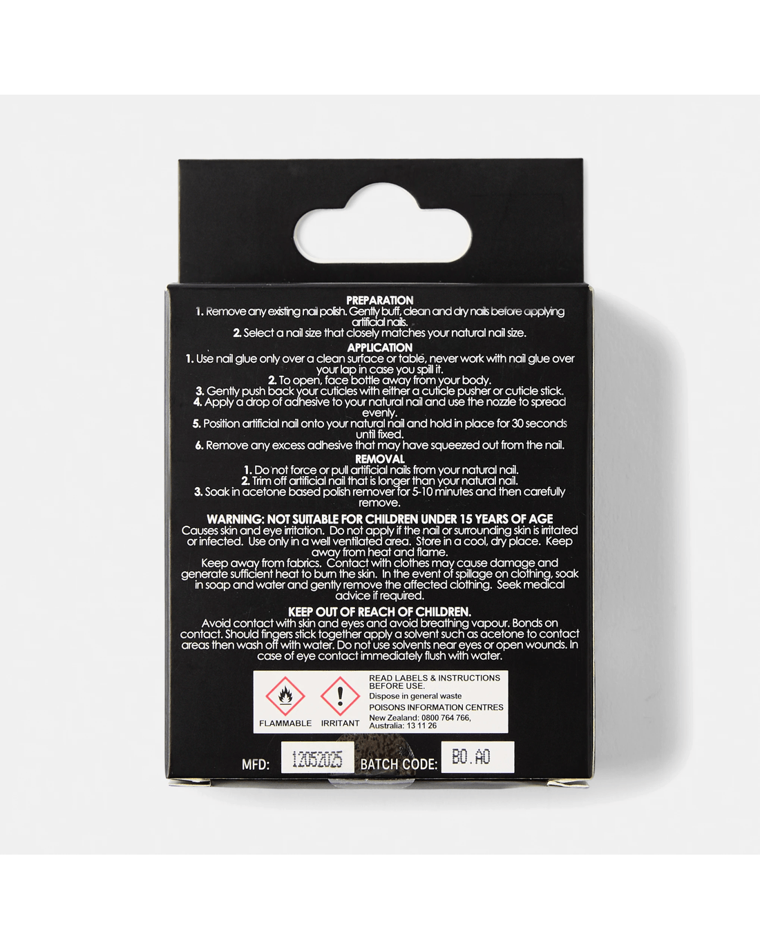 - Nail glue: Ethyl Cyanoacrylate, Polymethyl Methacrylate, Tris-Bht Mesitylene, Acetyl Tributyl Citrate, Tocopherol, Panthenol