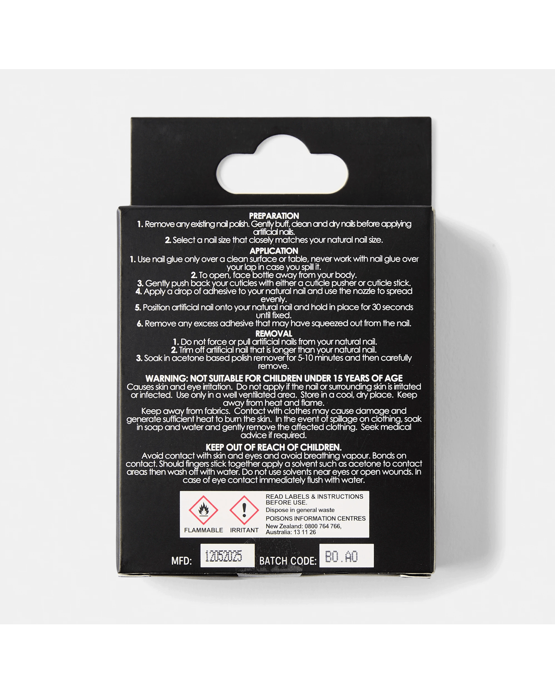- Nail glue: Ethyl Cyanoacrylate, Polymethyl Methacrylate, Tris-Bht Mesitylene, Acetyl Tributyl Citrate, Tocopherol, Panthenol