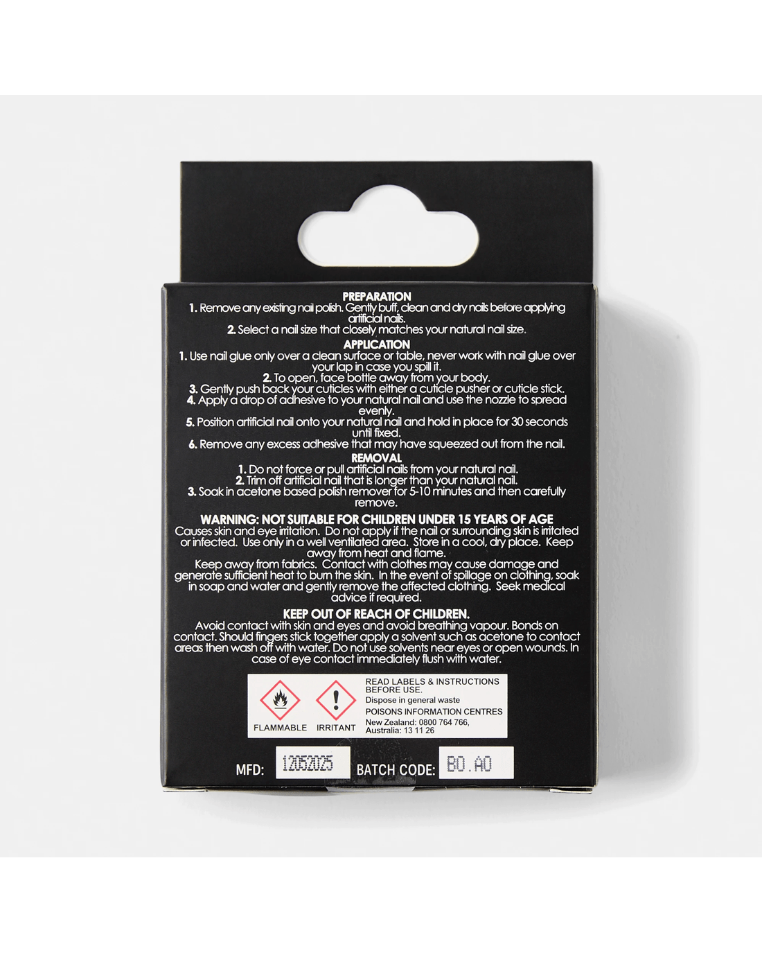 - Nail glue: Ethyl Cyanoacrylate, Polymethyl Methacrylate, Tris-BHT Mesitylene, Acetyl Tributyl Citrate, Tocopherol and Panthenol