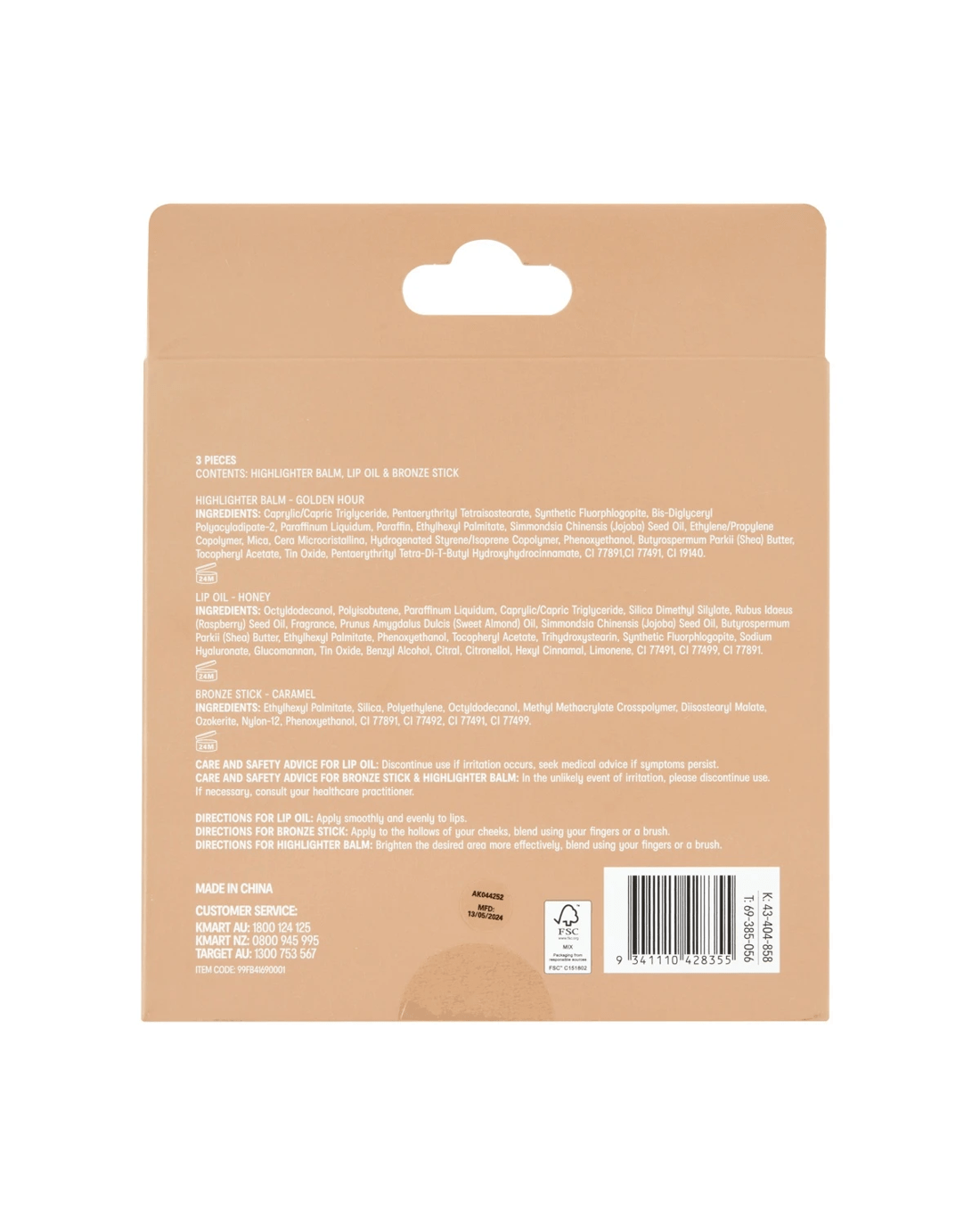 - Includes 1 x highlighter balm, 1 x lip oil and 1 x bronze stick