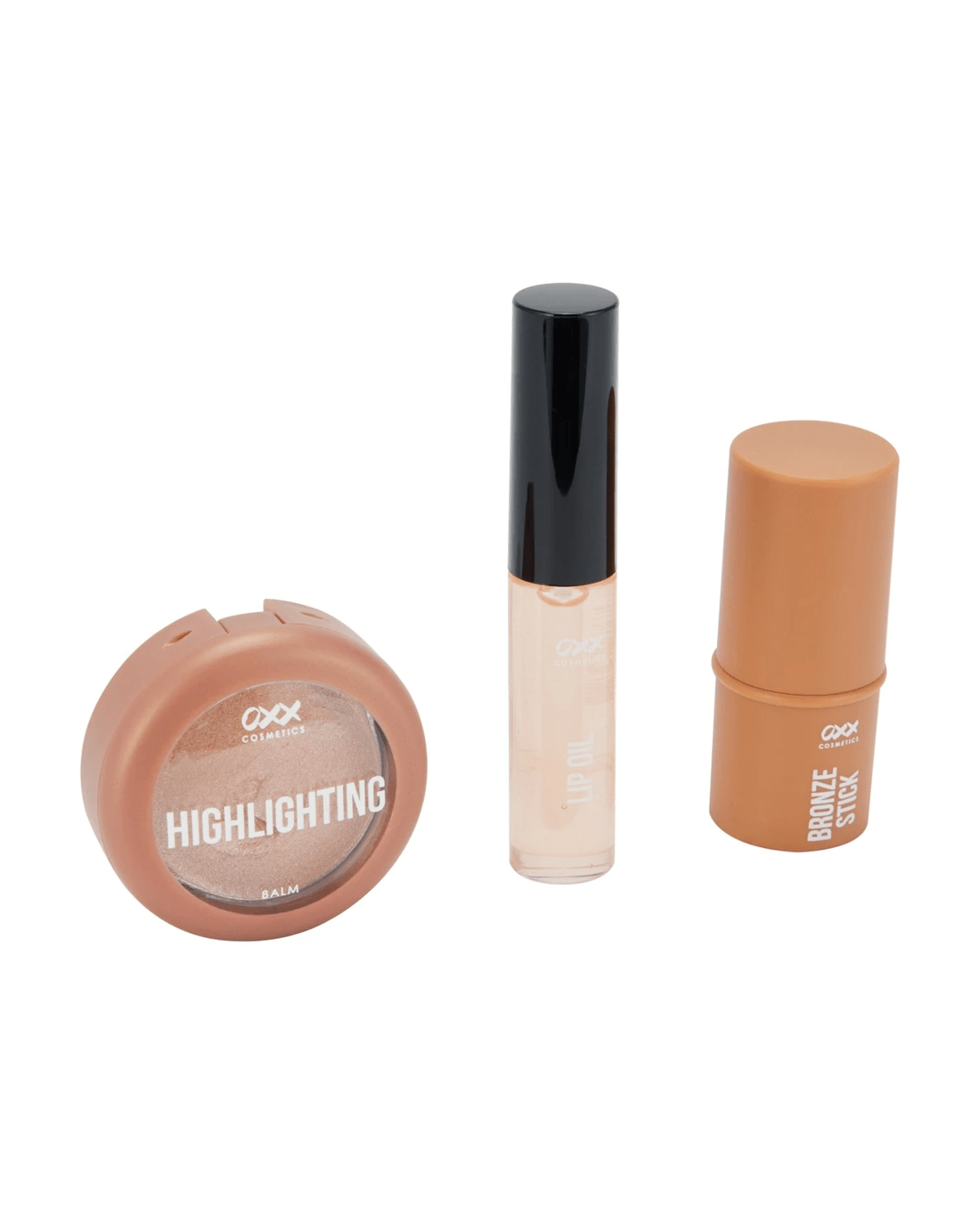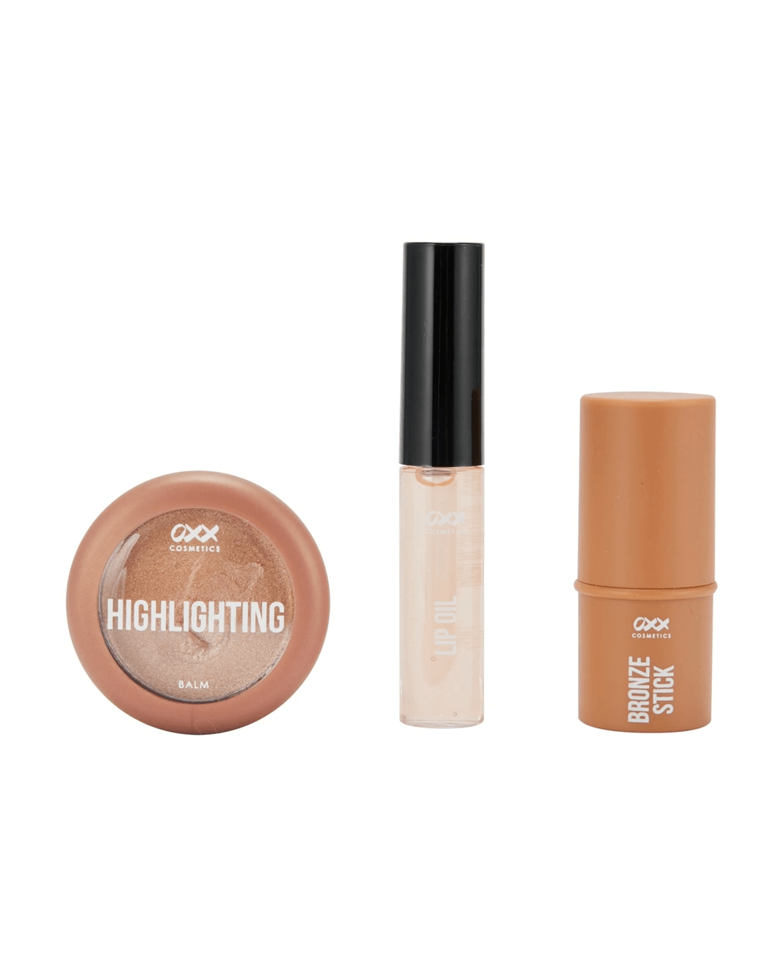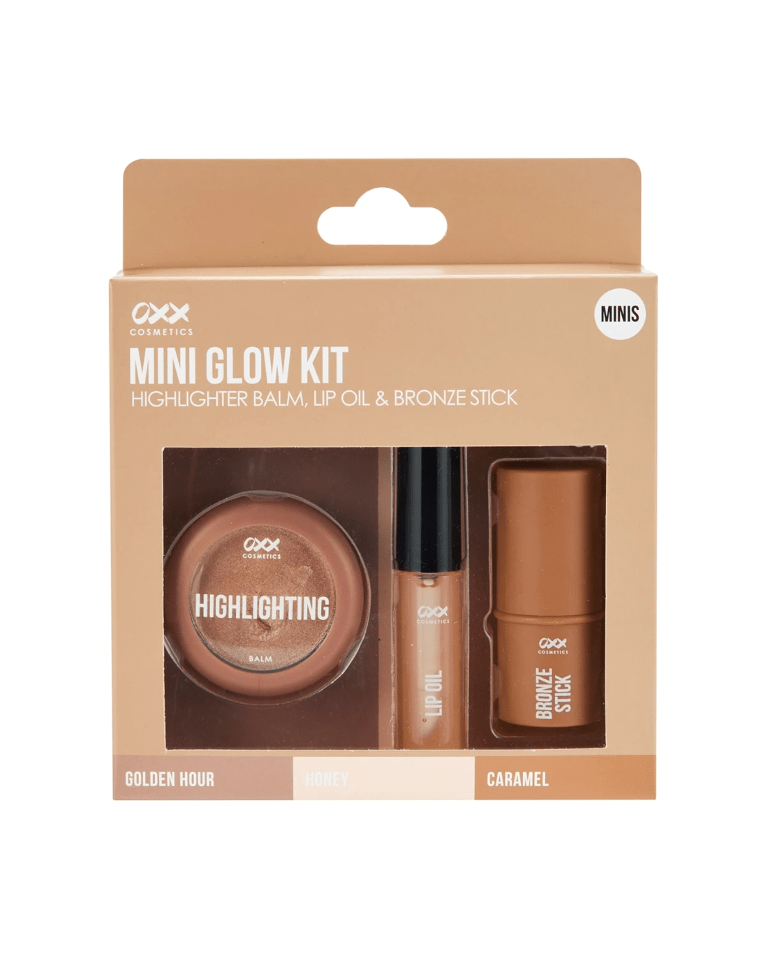 This OXX Cosmetics Mini Glow Kit includes a highlighter balm, lip oil and bronze stick perfect for adding a touch of shimmer and warmth to your look.
