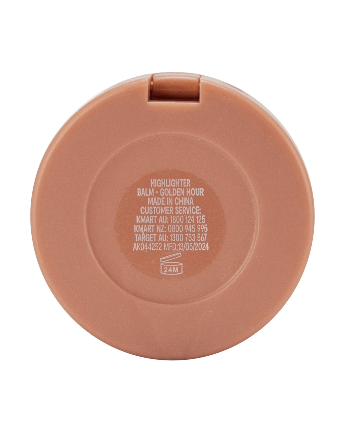 - Highlighter balm (Golden Hour): Caprylic/Capric Triglyceride, Pentaerythrityl Tetraisostearate, Synthetic Fluorphlogopite, Bis-Diglyceryl Polyacyladipate-2, Paraffinum Liquidum, Paraffin, Ethylhexyl Palmitate, Simmondsia Chinensis (Jojoba) Seed Oil, Ethylene/Propylene Copolymer, Mica, Cera Microcristallina, Hydrogenated Styrene/Isoprene Copolymer, Phenoxyethanol, Butyrospermum Parkii (Shea) Butter, Tocopheryl Acetate, Tin Oxide, Pentaerythrityl Tetra-Di-T-Butyl Hydroxyhydrocinnamate, CI 77891,CI 77491, CI 19140