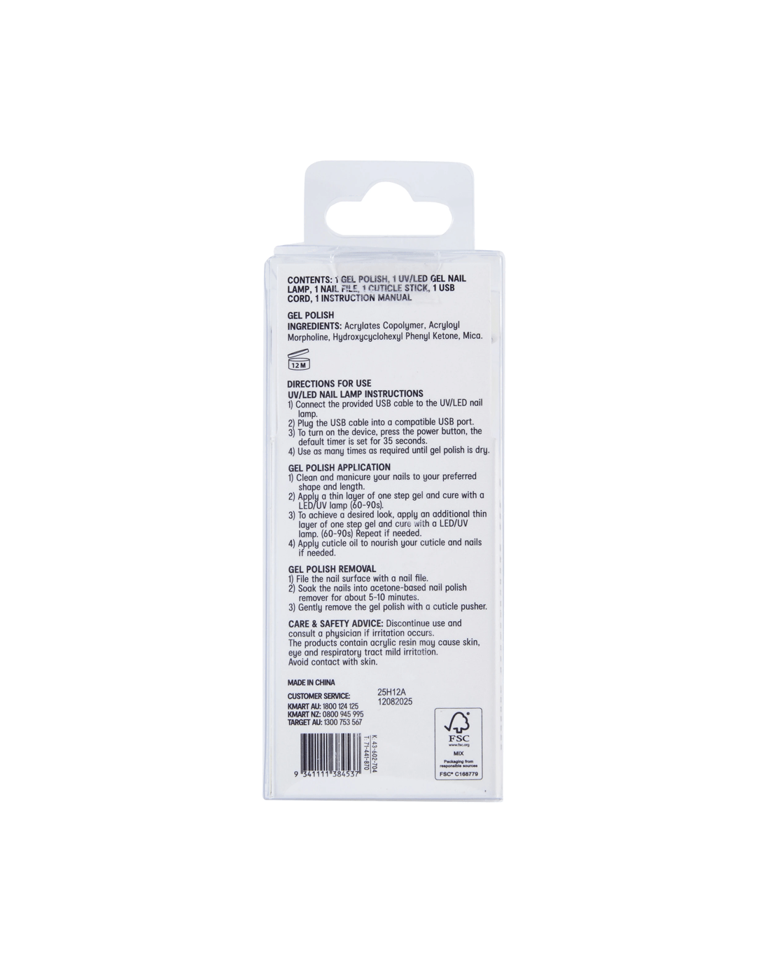 • Includes 1 x gel polish, 1 x UV/LED gel nail lamp, 1 x nail file, 1 x cuticle stick, 1 x USB cord and 1 x instruction manual