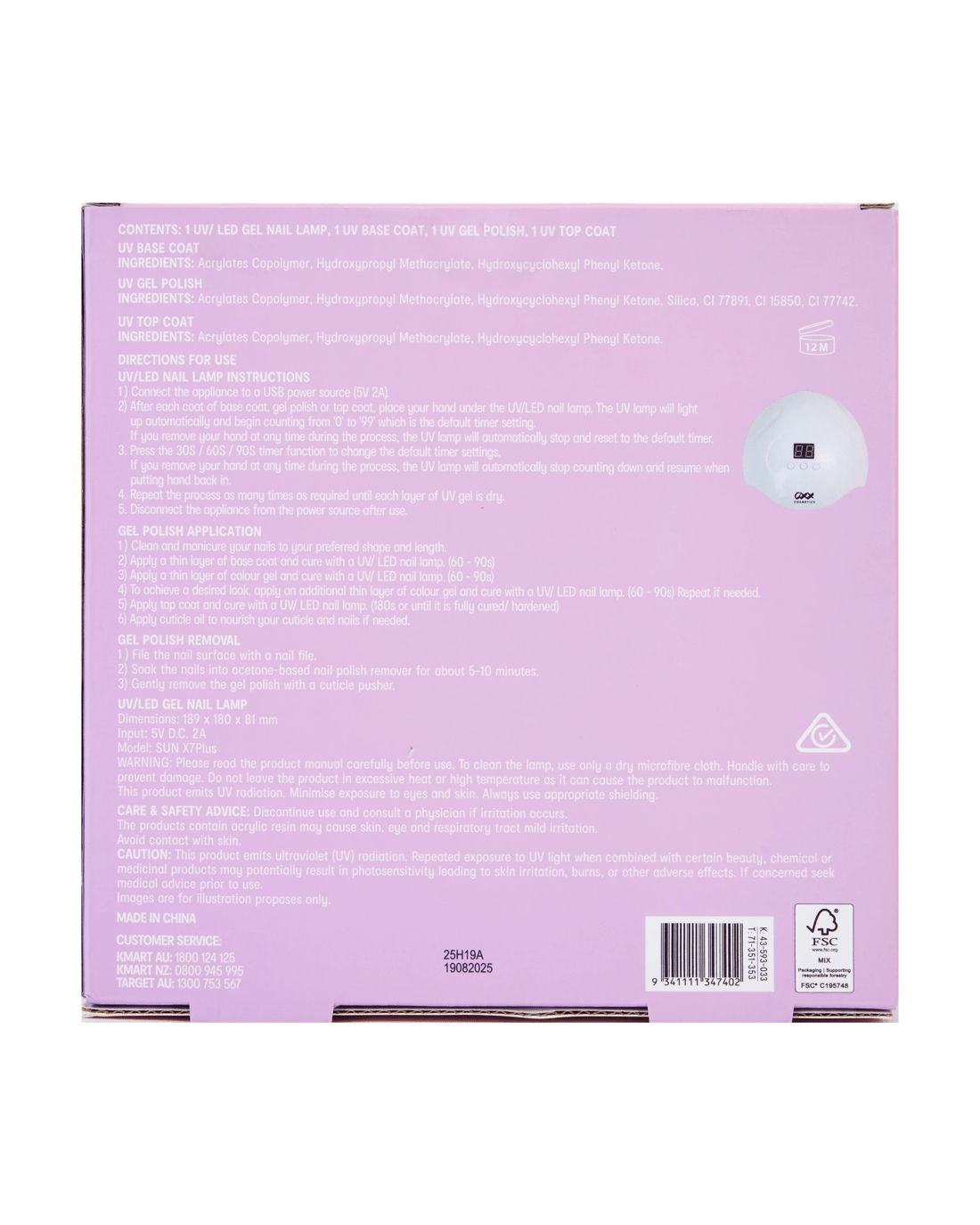 Product Details- Includes 1 x UV/LED gel nail lamp, 1 x UV base coat, 1 x UV gel polish and 1 x UV top coat
