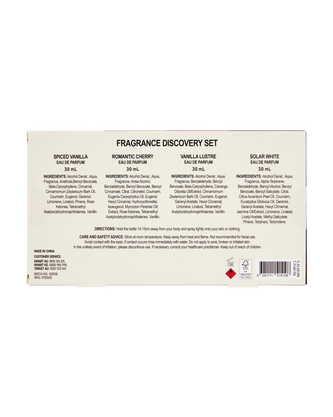 - Spiced Vanilla Eau De Parfum: Alcohol Denat., Aqua, Fragrance, Anethole, Benzyl Benzoate, Beta-Caryophyllene, Cinnamal, Cinnamomum Zeylanicum Bark Oil, Coumarin, Eugenol, Geraniol, Limonene, Linalool, Pinene, Rose Ketones, Tetramethyl Acetyloctahydronaphthalenes, Vanillin