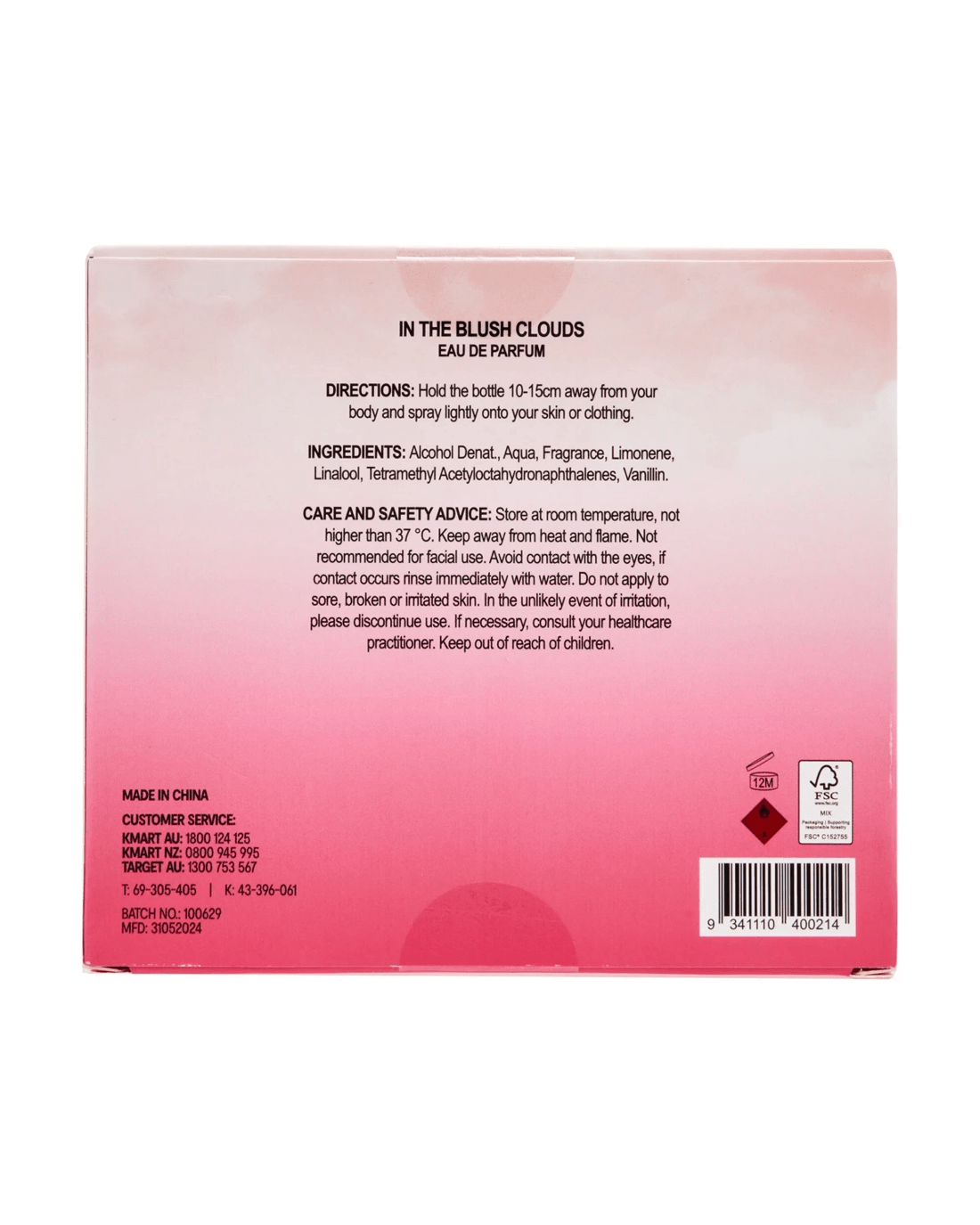• Ingredients: Alcohol Denat., Aqua, Fragrance, Limonene, Linalool, Tetramethyl Acetyloctahydronaphthalenes and Vanillin