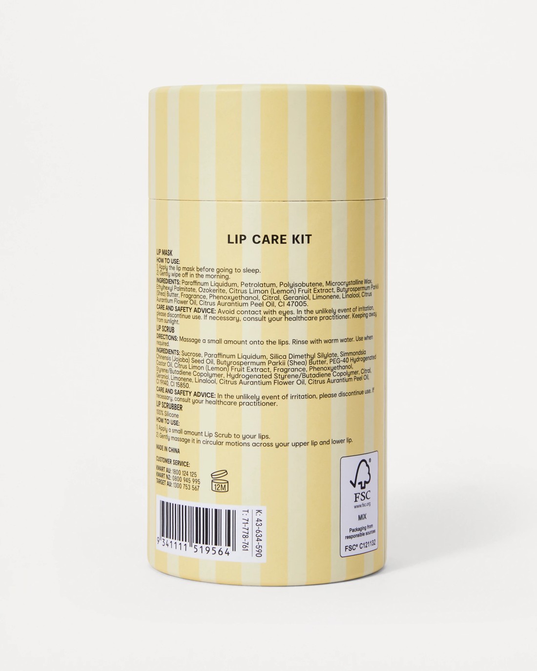- Lip scrub: Sucrose, Paraffinum Liquidum, Silica Dimethyl Silylate, Simmondsia Chinensis (Jojoba) Seed Oil, Butyrospermum Parkii (Shea) Butter, PEG-40 Hydrogenated Castor Oil, Citrus Limon (Lemon) Fruit Extract, Fragrance, Phenoxyethanol, Styrene/Butadiene Copolymer, Hydrogenated Styrene/Butadiene Copolymer, Citral, Geraniol, Limonene, Linalool, Citrus Aurantium Flower Oil, Citrus Aurantium Peel Oil, CI 19140 and CI 15850