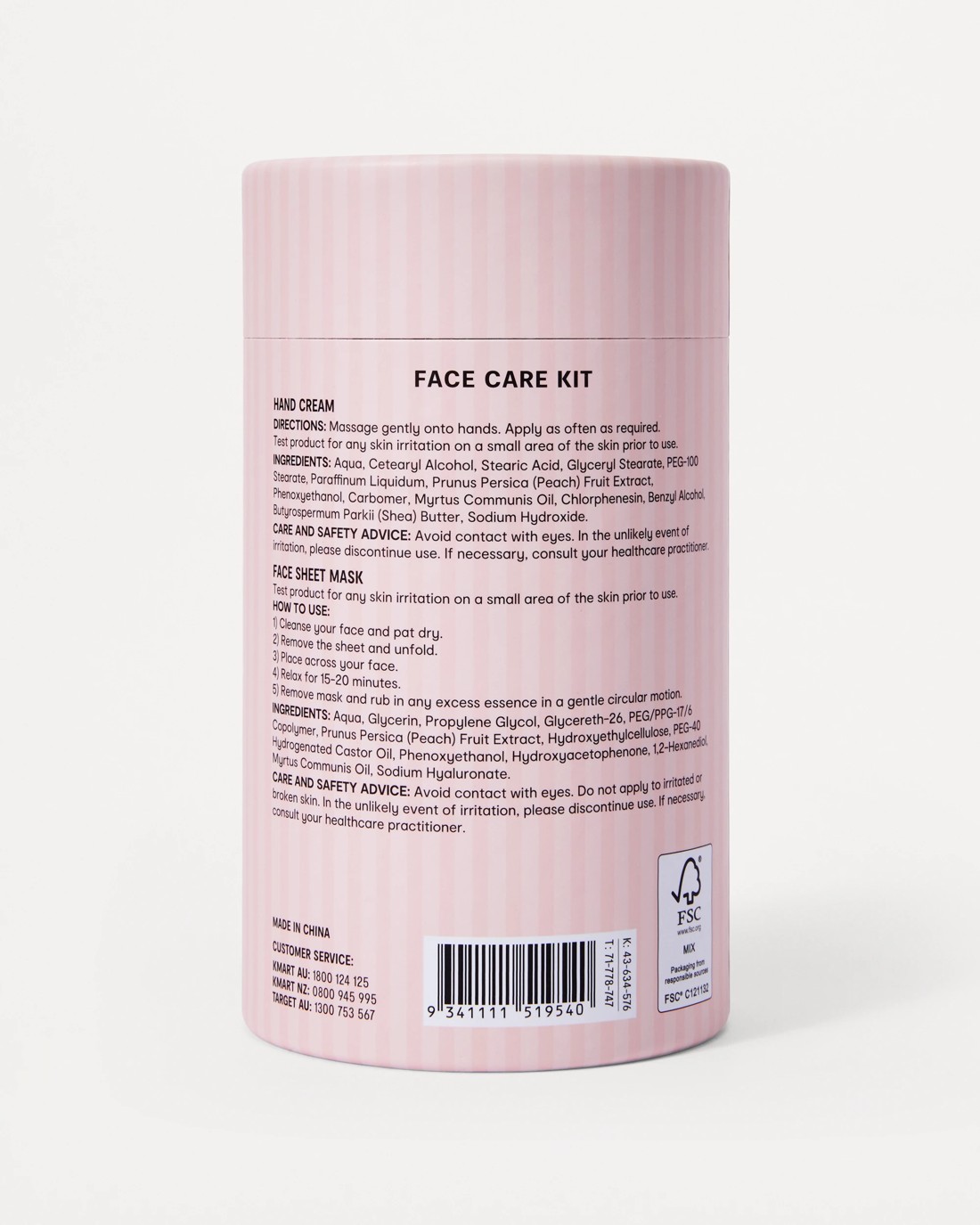 • Hand cream: Aqua, Cetearyl Alcohol, Stearic Acid, Glyceryl Stearate, PEG-100 Stearate, Paraffinum Liquidum, Prunus Persica (Peach) Fruit Extract, Phenoxyethanol, Carbomer, Myrtus Communis Oil, Chlorphenesin, Benzyl Alcohol, Butyrospermum Parkii (Shea) Butter and Sodium Hydroxide