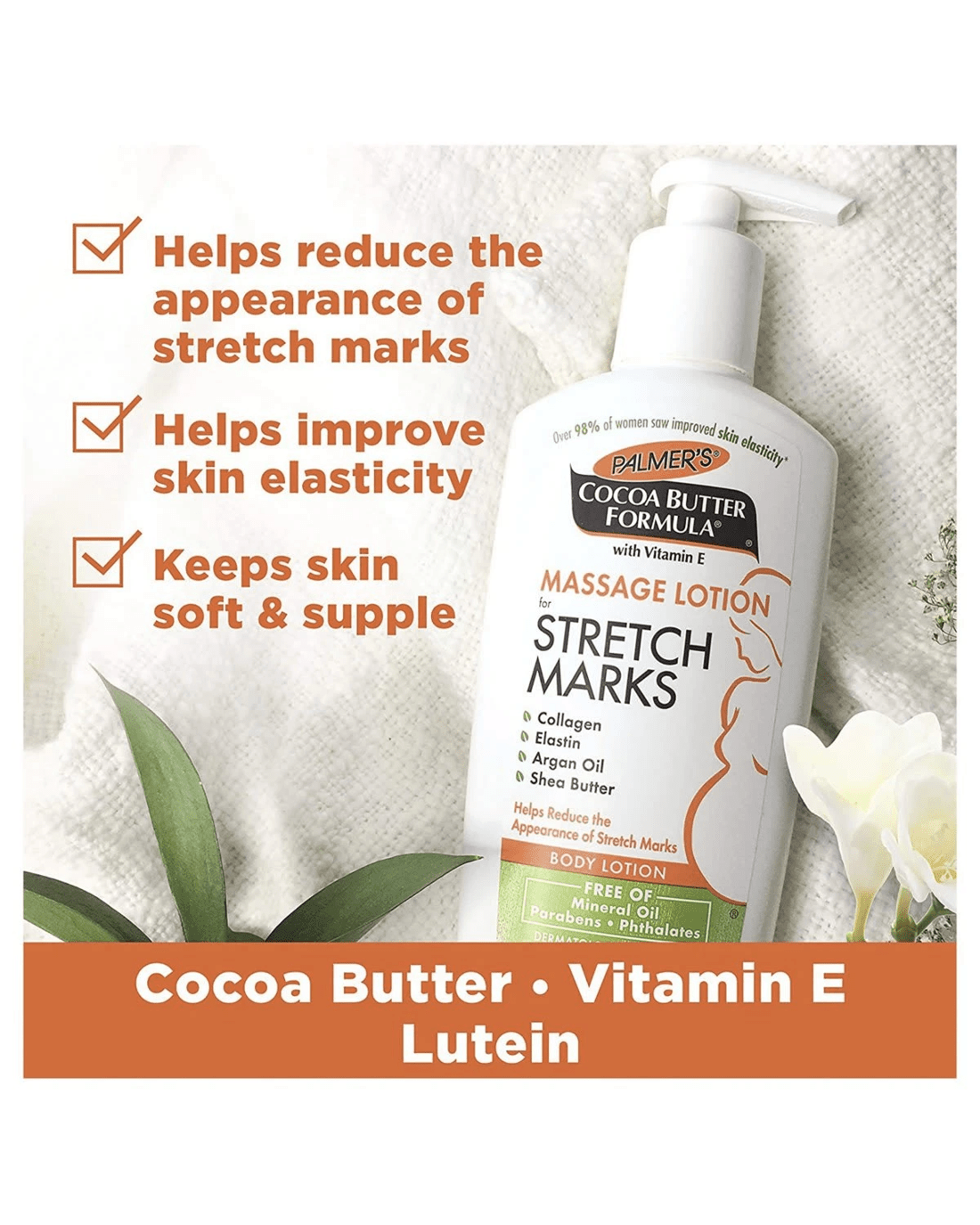 Palmer's® Cocoa Butter Formula Massage Lotion for Stretch Marks contains Pure Cocoa Butter and Shea Butter, Natural Oils, Collagen, Elastin and Lutein to keep skin moisturised and supple for 48 hours, allowing skin to stretch more easily. Widely recommended for stretch marks during and after pregnancy or weight fluctuation. This non-greasy lotion is ideal for all over body use, in place of your regular moisturiser. Clinically proven. Over 98% of women saw improved skin elasticity, texture and tone.