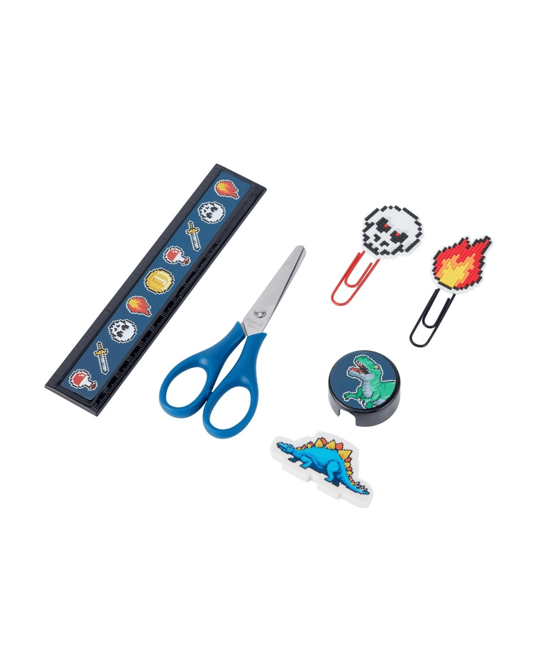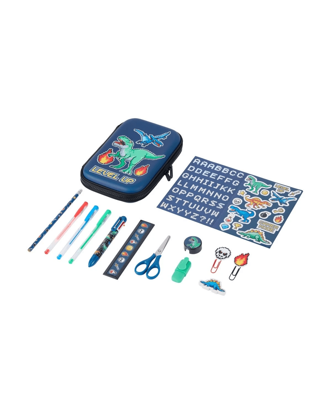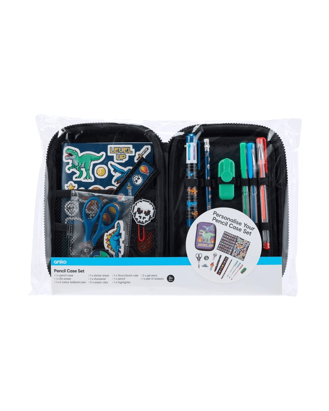 - Includes 1 x pencil case, 1 x 2D eraser, 1 x 6 colour ballpoint pen, 2 x paper clips, 1 x sticker sheet, 1 x sharpener, 1 x ruler, 3 x gel pens, 1 x pencil, 1 x pair of scissors and 1 x highlighter