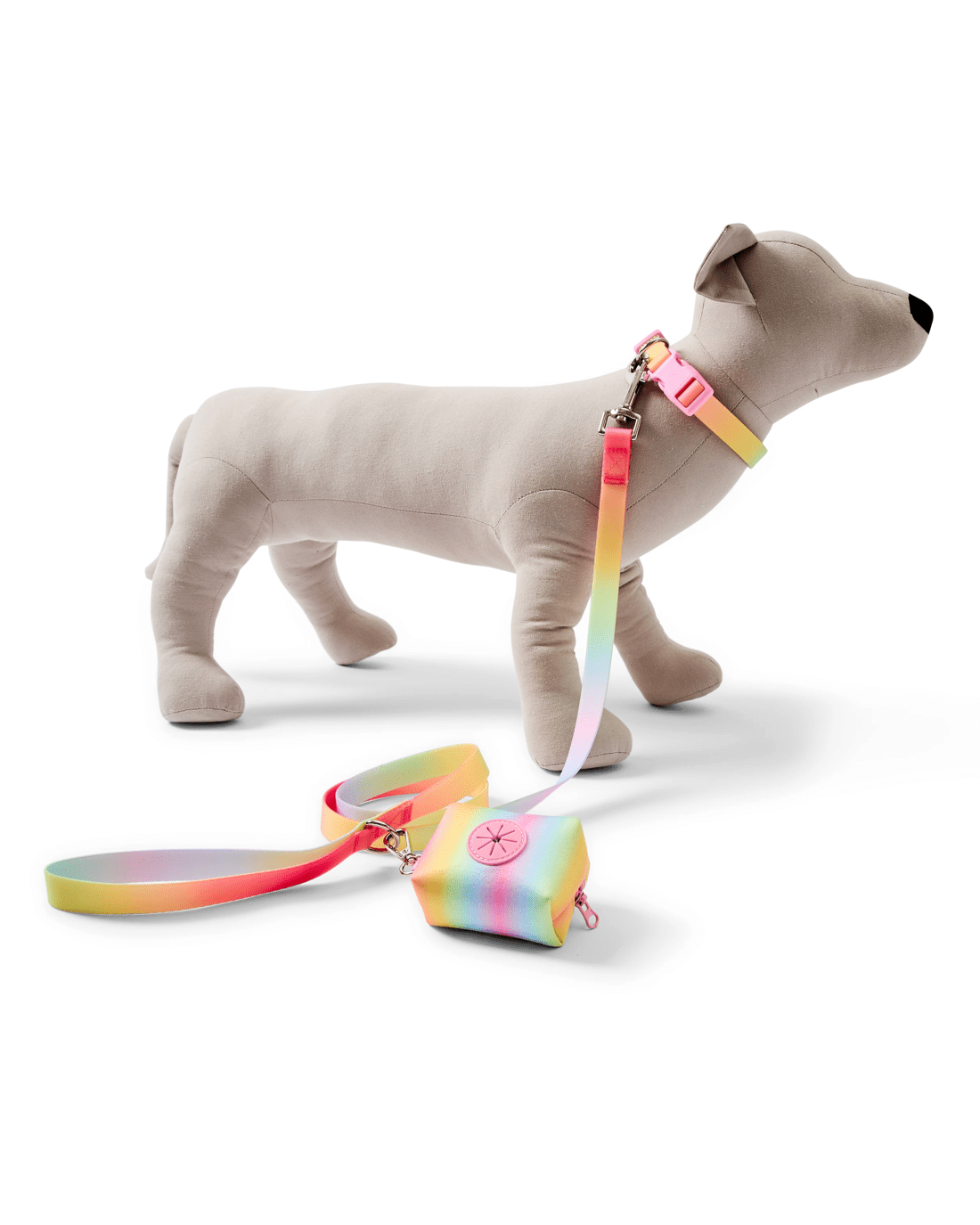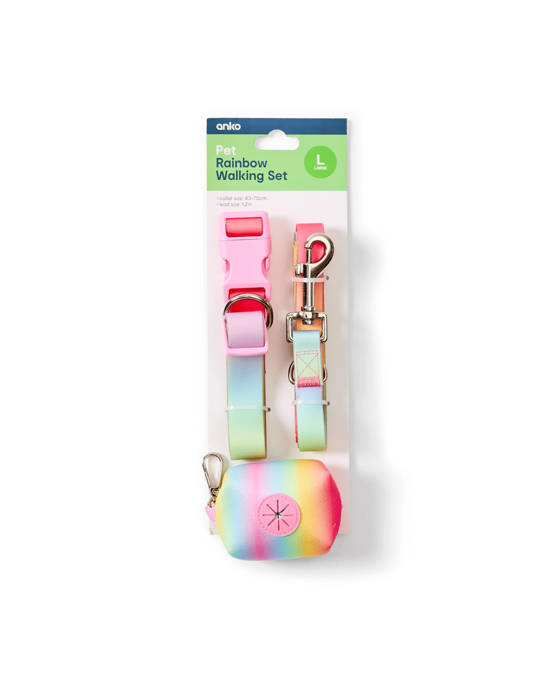 The Pet Rainbow Walking Set features a vibrant matching harness and leash, offering a coordinated and eye-catching look for daily walks.