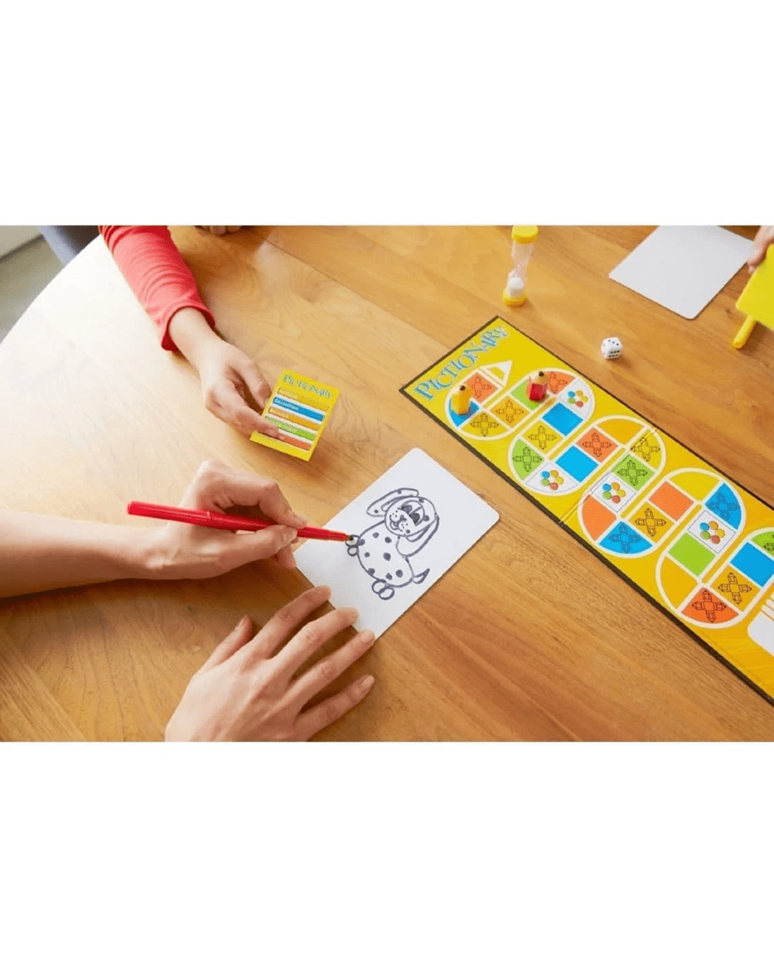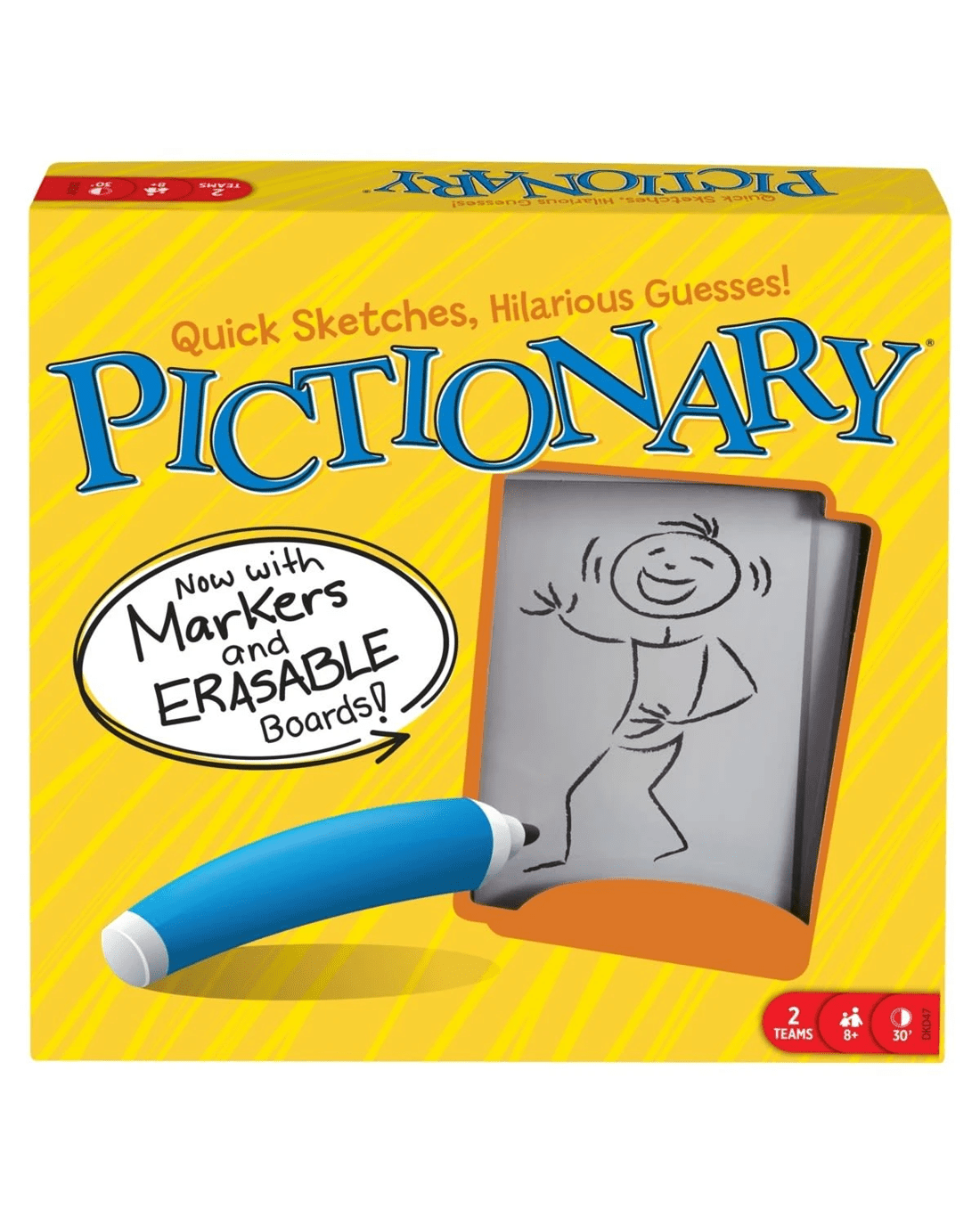 Count on big laughs when you and your friends get together to find out who's an artist and who really isn't! In this quick-draw classic, the guesses can be just as hilarious as the sketches, as you use markers to draw your best rendition of the clue on the card. You have one minute to convey what's on the card. Is it an animal? A person? An action? Just what is that word you're drawing?? If your team members just aren't getting it, try a different direction; you never know what kinds of clues might trigger the answer. You take turns drawing, so all players get to channel their inner artists! Don't worry if 'can't draw', the game can be even funnier, and the laughs just keep coming! Two levels of clues (120 adults, 80 junior) make this a great game for both kids and adults! Year after year since 1985, Pictionary has proven itself to be the ultimate party game!