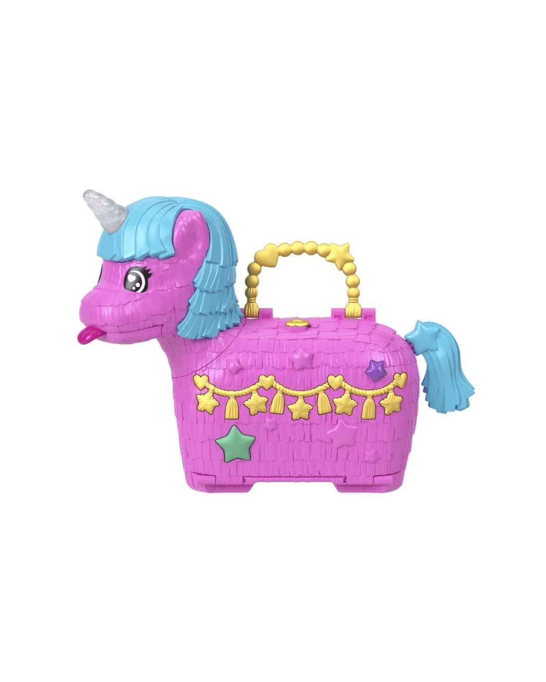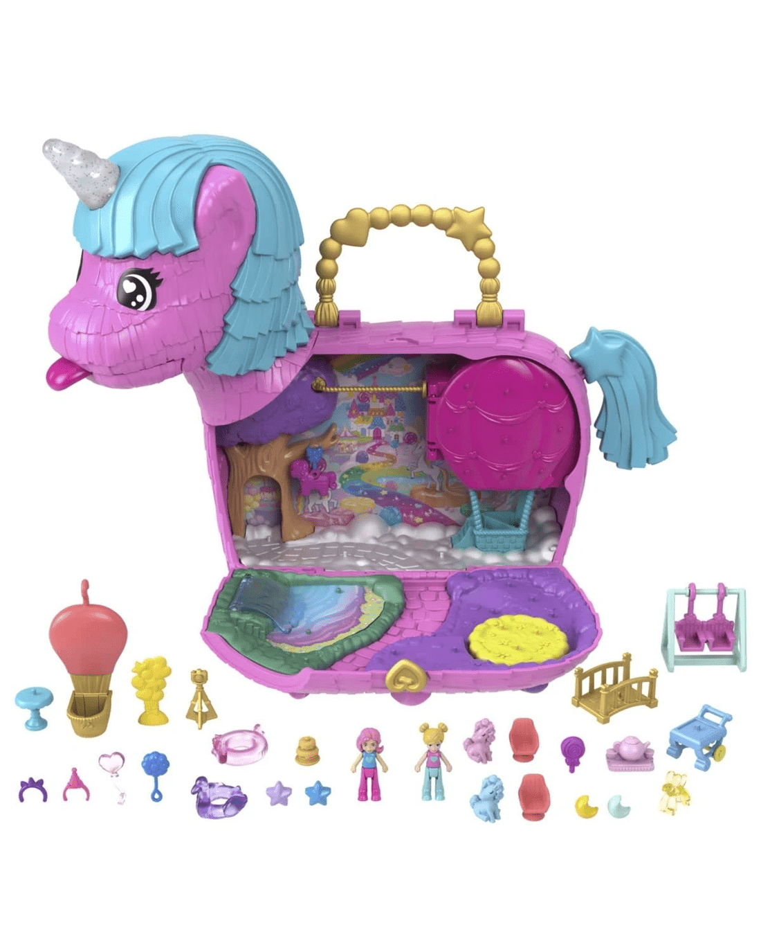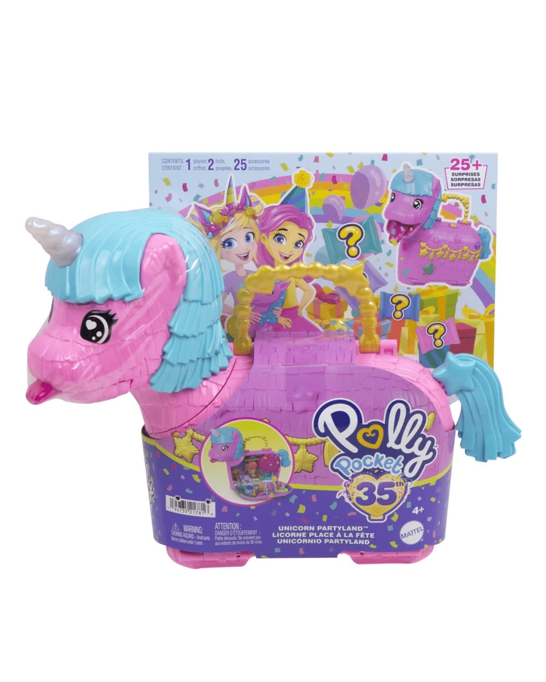 - This Polly Pocket Unicorn Partyland playset is full of festive fun! Everyone's invited to celebrate Polly's 35th anniversary with 2 micro dolls and 25 accessories, including pets