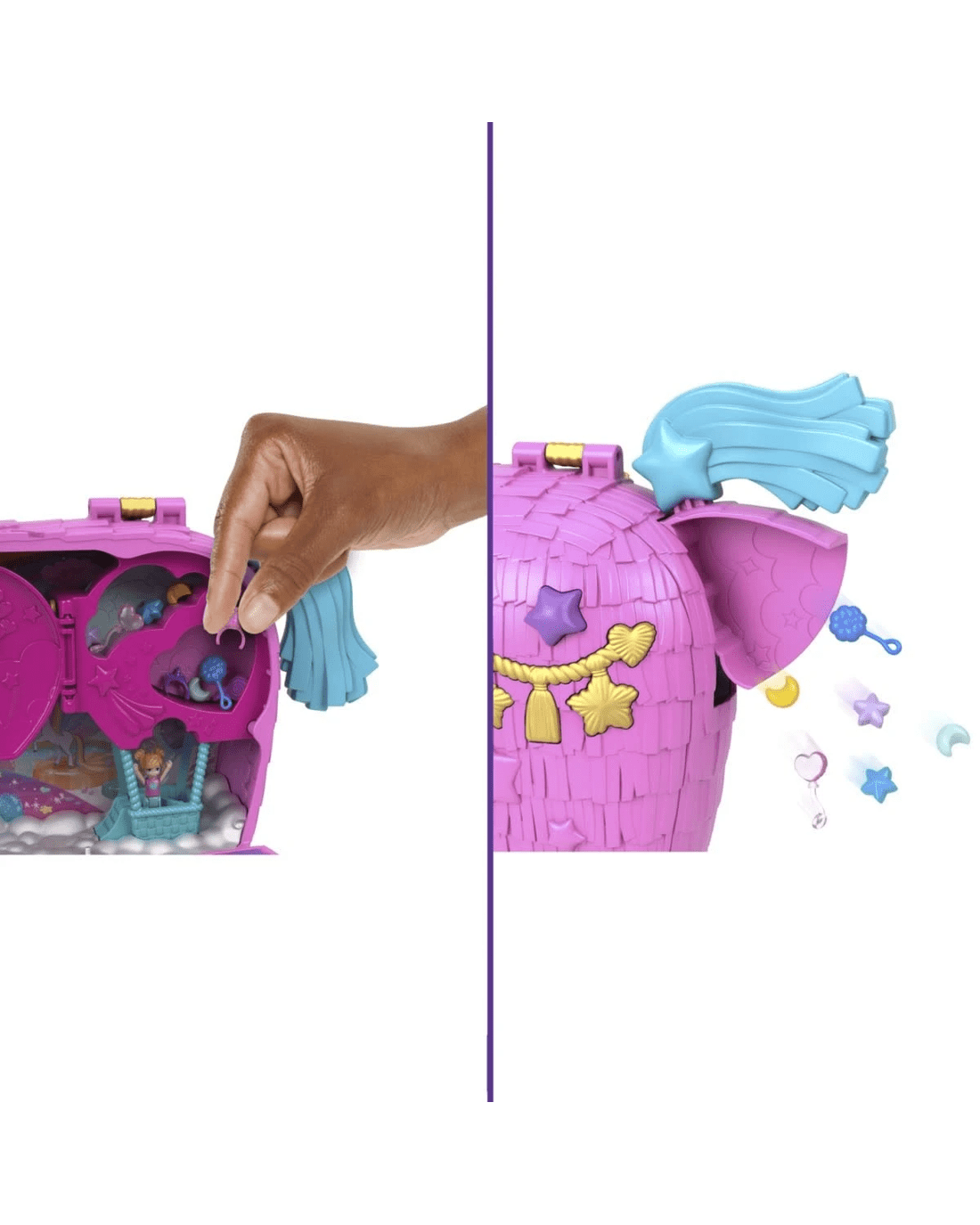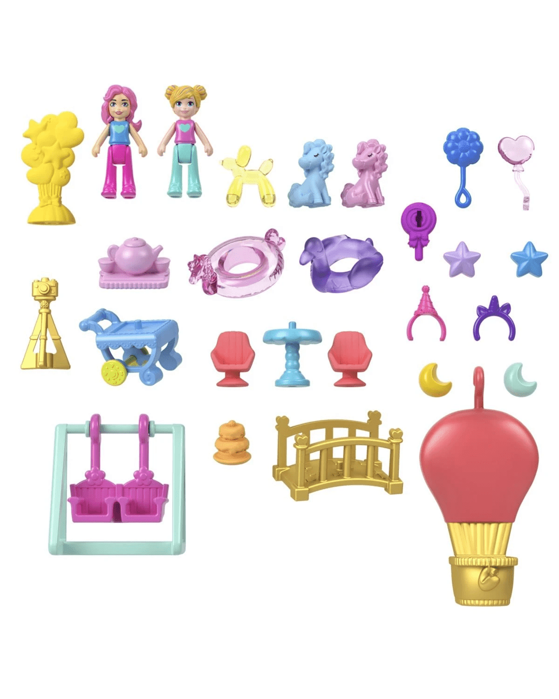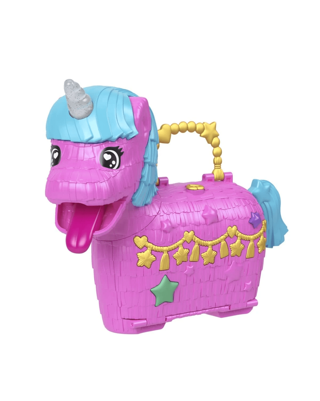 - This Polly Pocket Unicorn Partyland playset is full of festive fun! Everyone's invited to celebrate Polly's 35th anniversary with 2 micro dolls and 25 accessories, including pets
