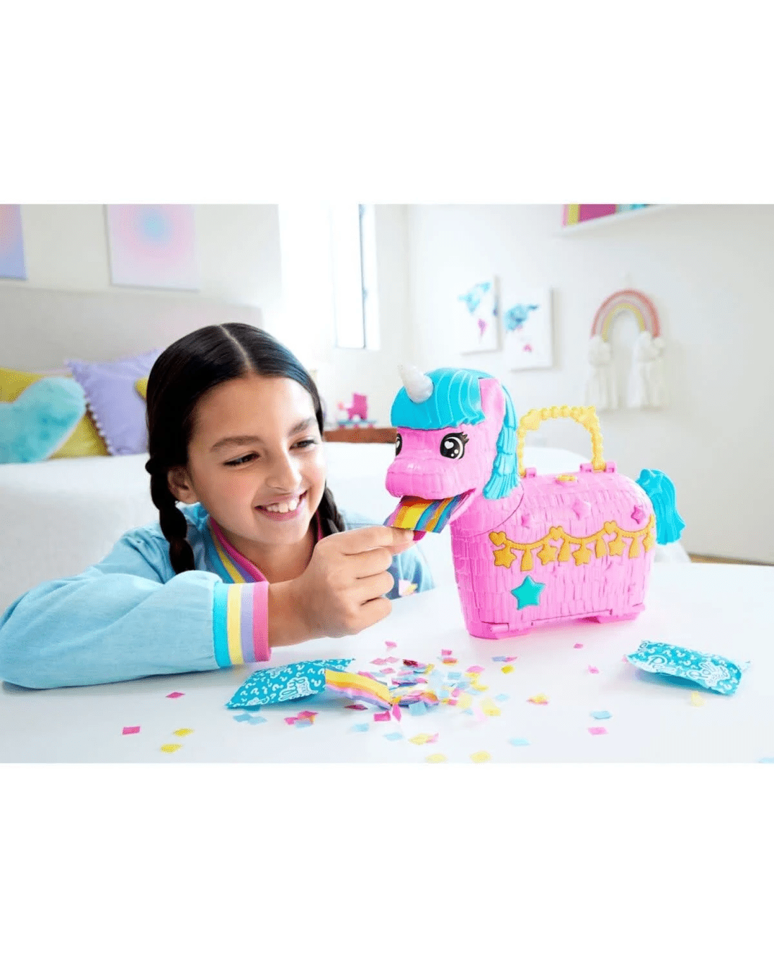 - Open the adorable exterior of the unicorn pinata and bring the party to life with accessories like balloons, party hats, a mini pinata that swings and cake to share with friends!