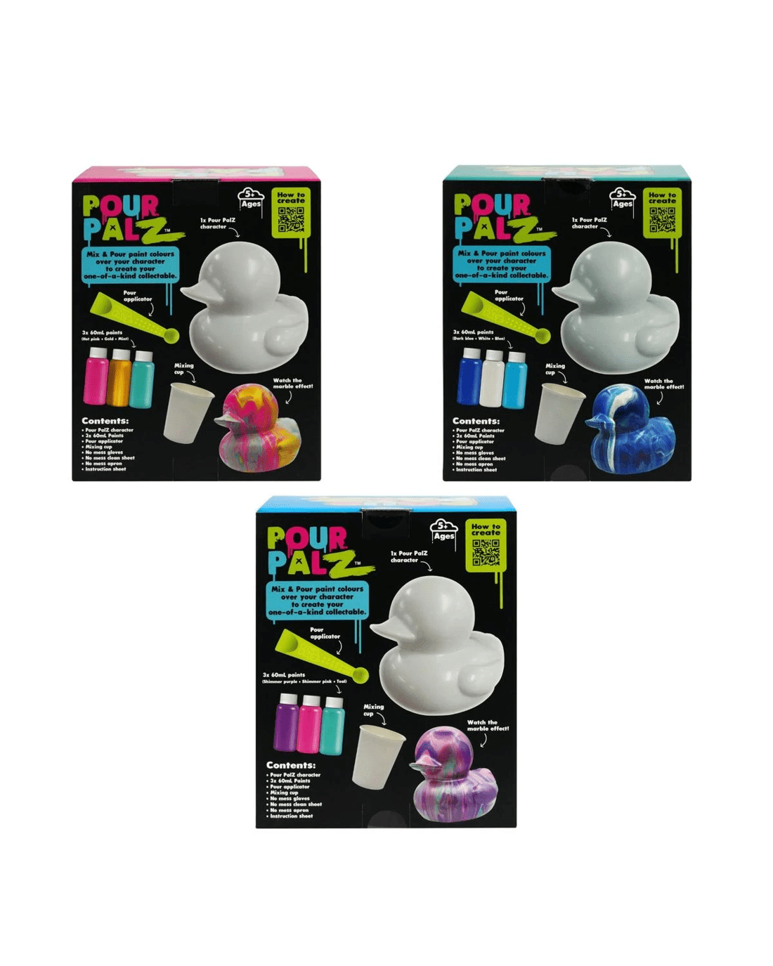 - Includes 1 x Pour Palz character, 3 x paints, 1 x pour applicator, 1 x mixing cup, 1 x no mess gloves, 1 x no mess clean sheet, 1 x no mess apron and 1 x instruction sheet