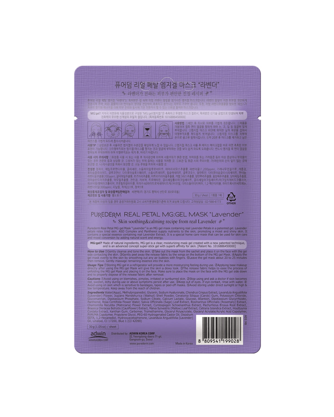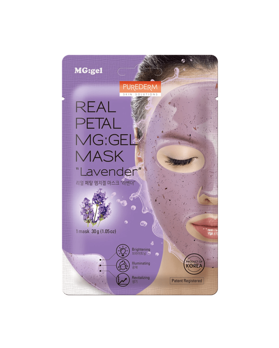 Purederm Real Petal MG:Gel Mask 'Lavender' is an MG:Gel mask containing real lavender petals in a patented gel. Lavender petals relax with calm. ASD Complex and Panthenol supply nutrients to the skin, promoting a brighter, illuminated and revitalised looking skin. It contains a special essence containing the real lavender extract. It is a special home care mask that can be used for skincare and quiet time by adding scent and energy.