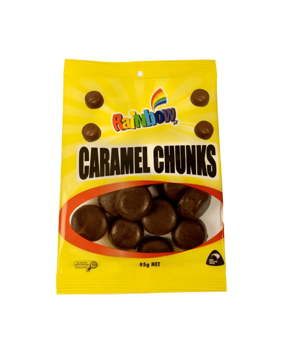 - Caramel flavoured chewy candy coated in smooth milk chocolate